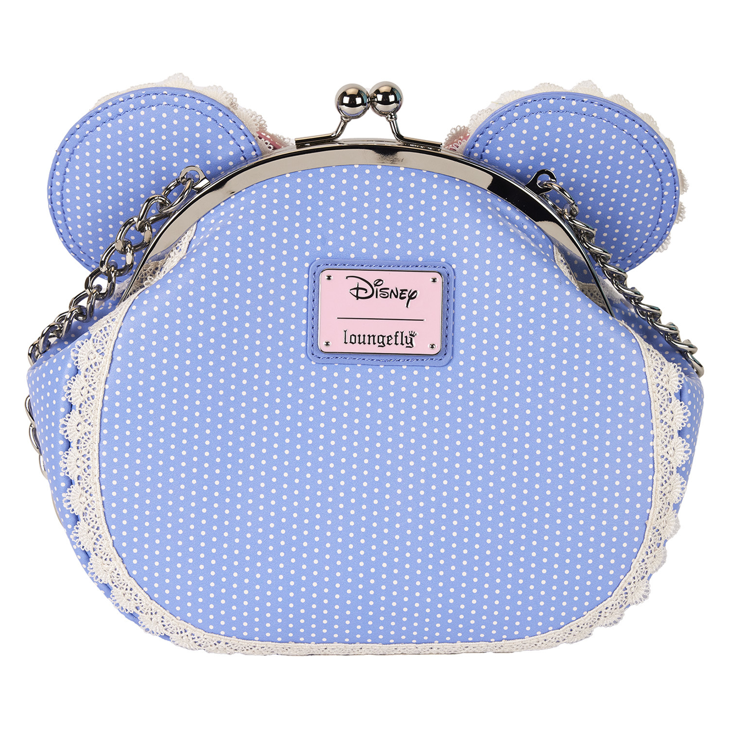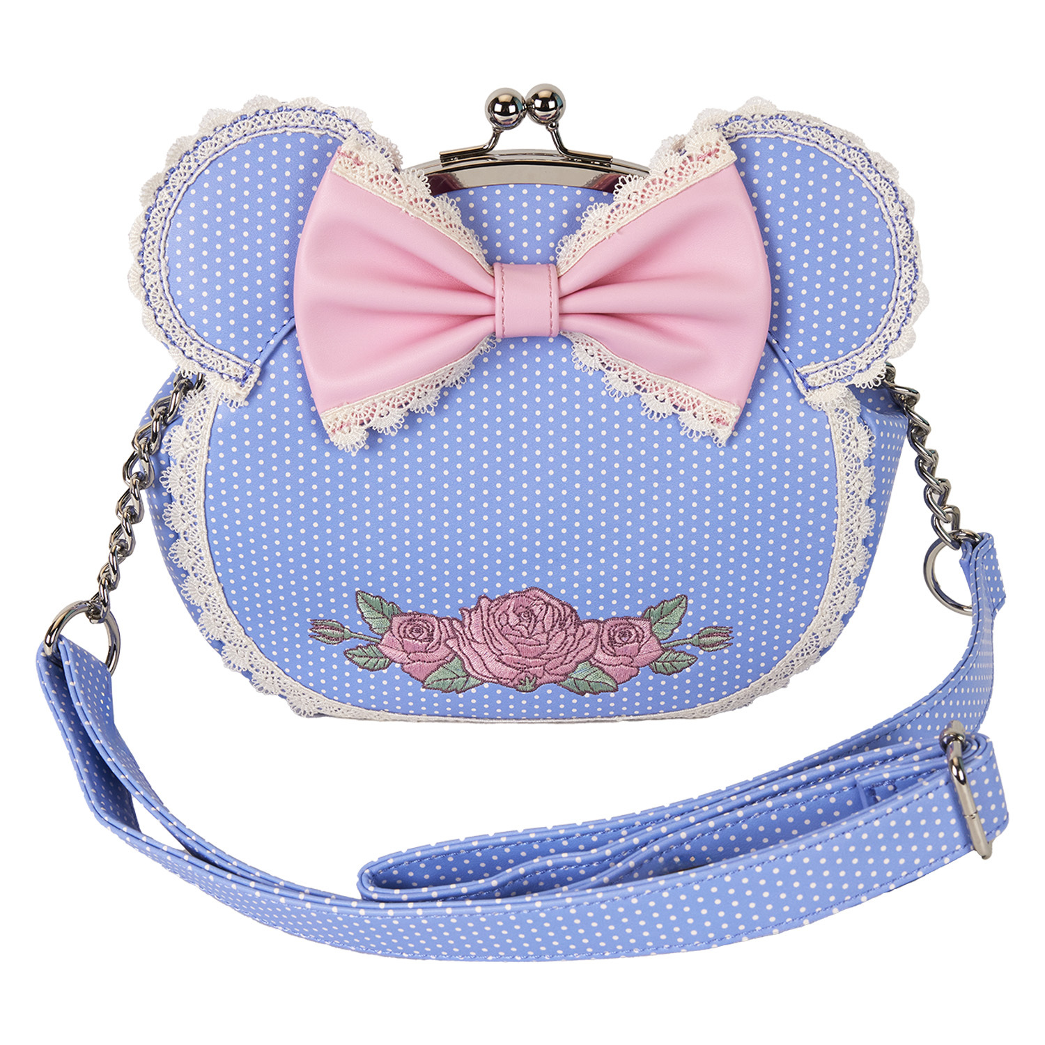 La Mode est à son comble avec ce sac bandoulière Disney Minnie Mouse « kiss-lock ». Les ornements Minnie Mouse et le fermoir à griffes entrelacées confèrent à cet accessoire un charme désuet. Ses oreilles en appliqué, décorées d'un imprimé à pois, se relèvent sur le dessus, et la bordure en dentelle ajoute une touche délicate. Un nœud rose en 3D orne le centre et des roses brodées se déploient en détails décoratifs. Emportez vos essentiels du quotidien, partez à l'aventure et admirez la joie s'épanouir.