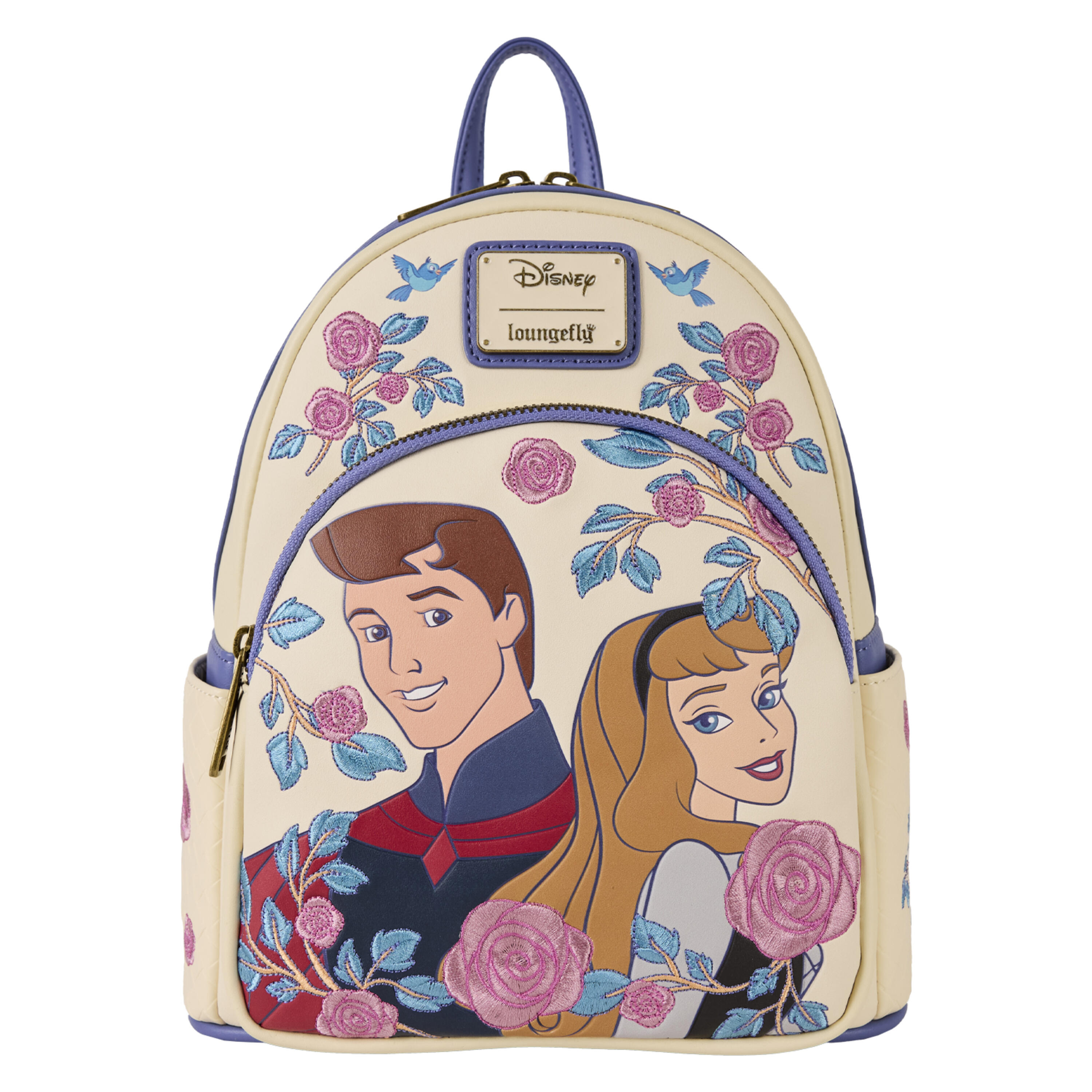 De magnifiques roses roses sont brodées autour d'une image du prince Philippe et de la princesse Aurore de La Belle au bois dormant de Disney. D'autres détails floraux apparaissent sur les poches latérales sur un fond en similicuir tissé pour un design plus dynamique.