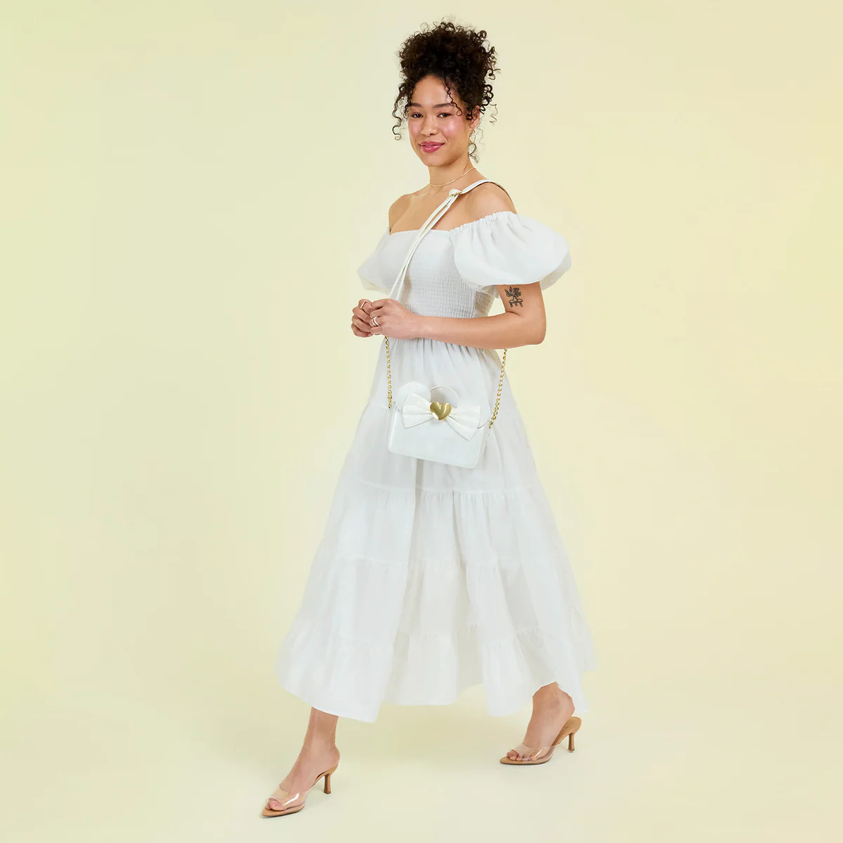 Faites de chaque instant un moment privilégié avant le grand jour. Que vous soyez une future mariée ou que vous connaissiez quelqu'un qui l'est, ce sac bandoulière est l'accessoire idéal pour tous les événements, avant et après le mariage ! Brillez de mille feux avec ce sac bandoulière en similicuir scintillant et en dentelle irisée. Un pendentif cœur en métal moulé doré au centre du nœud ajoute une touche d'éclat supplémentaire. Un bel accessoire qui s'harmonisera avec la beauté de votre saison de mariage !