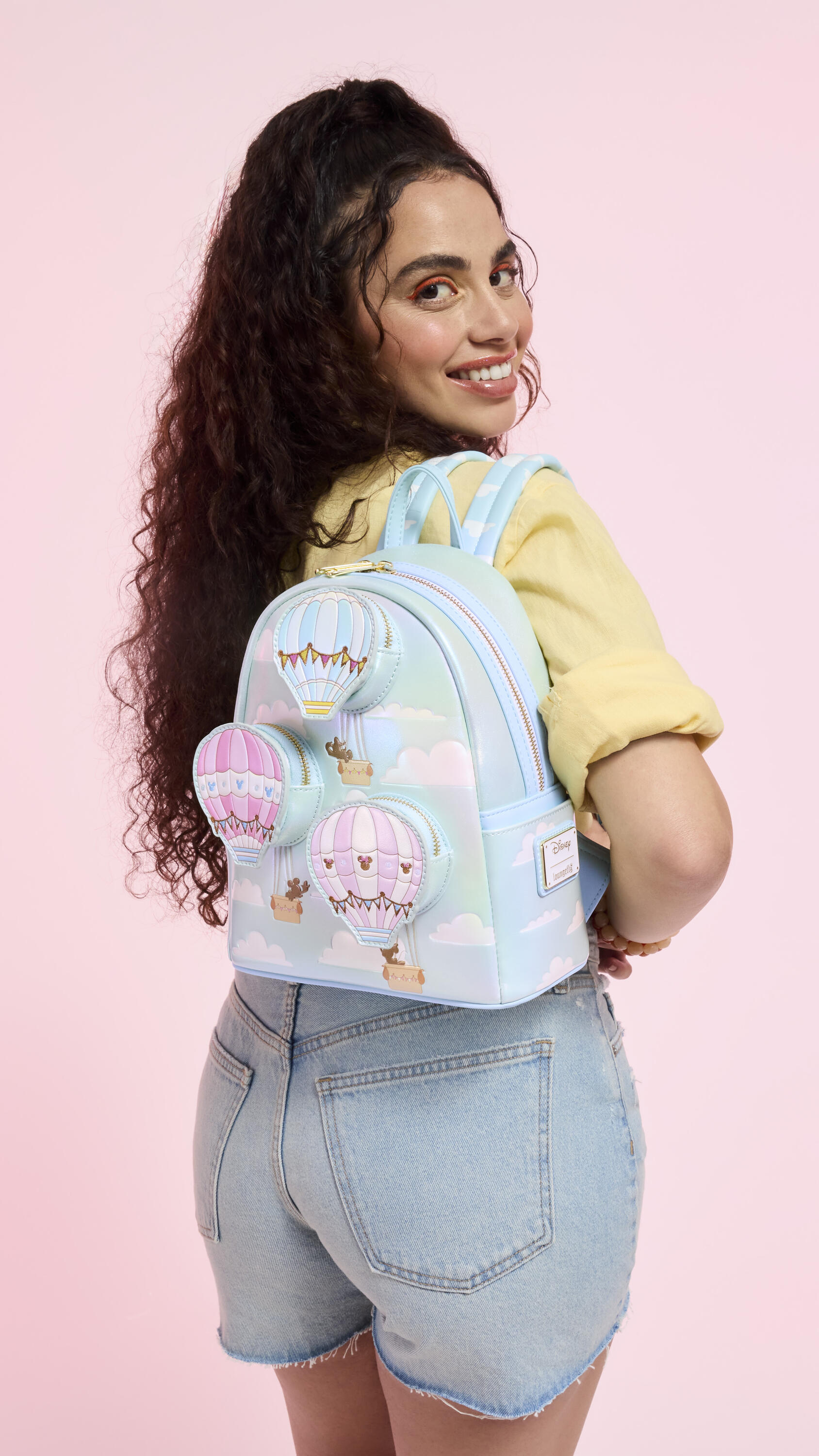 Ce mini sac à dos est doté de trois mini poches avant qui ressemblent à des montgolfières flottant dans les nuages. Regardez bien : vous y trouverez les silhouettes de vos personnages Disney préférés. La matériel nacrée et les nuages illustrés sur les bretelles complètent le look.
