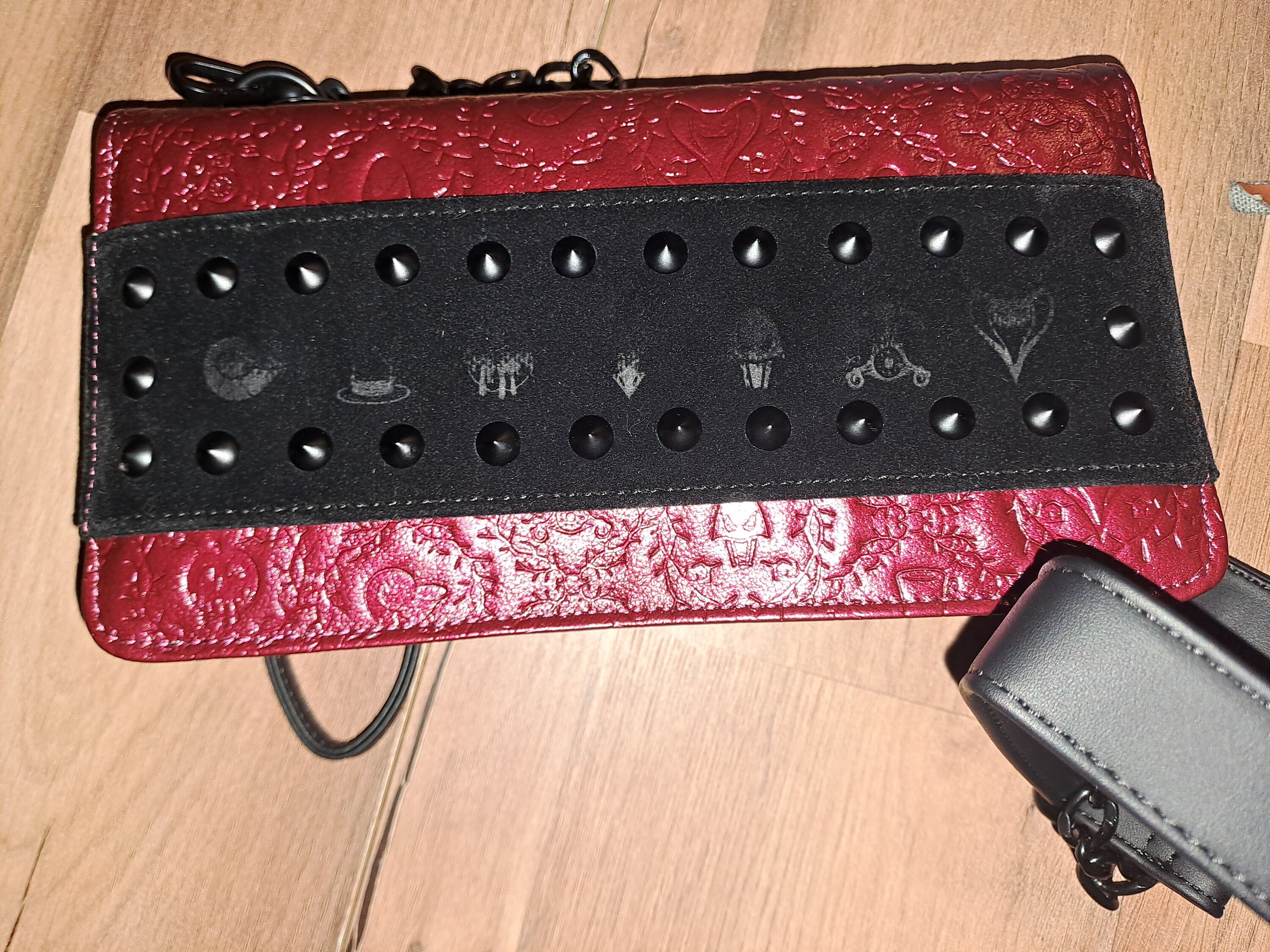 Retrouvez les symboles gravés des méchants Disney populaires parmi les épines pointues sur tout le sac. Des cônes cloutés et du velours complètent le look. Ce modèle est polyvalent : vous pouvez le porter comme une pochette grâce à la dragonne ou attacher la bandoulière pour le porter comme un sac à main !