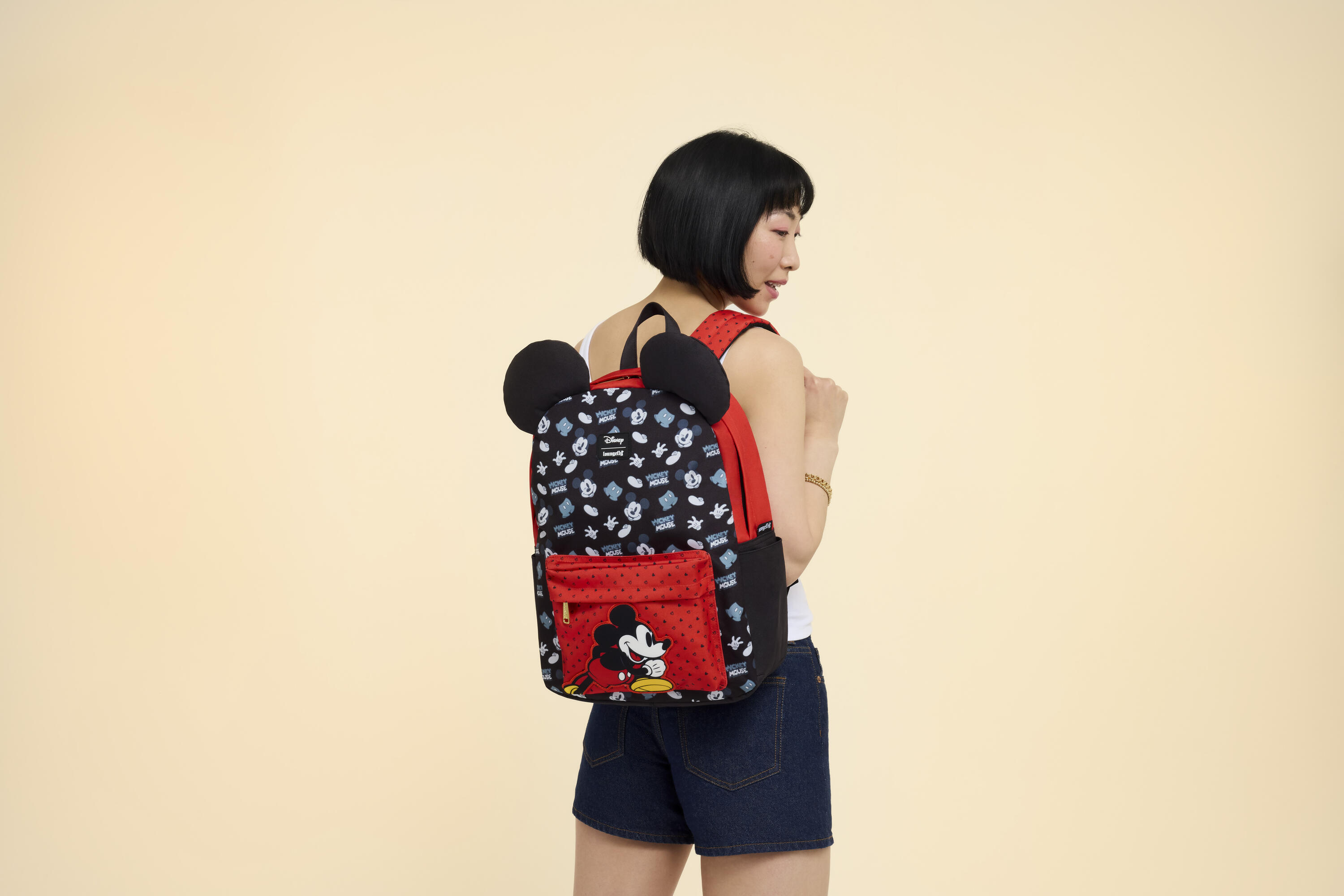 Ce sac à dos arbore Mickey Mouse sur la poche avant rouge : il est toujours en mouvement ! Sur tout le devant du sac, vous trouverez des motifs de Mickey, notamment ses gants, sa tenue, ses chaussures et bien plus encore ! Le haut du sac est même doté d'oreilles de Mickey en 3D qui dépassent !