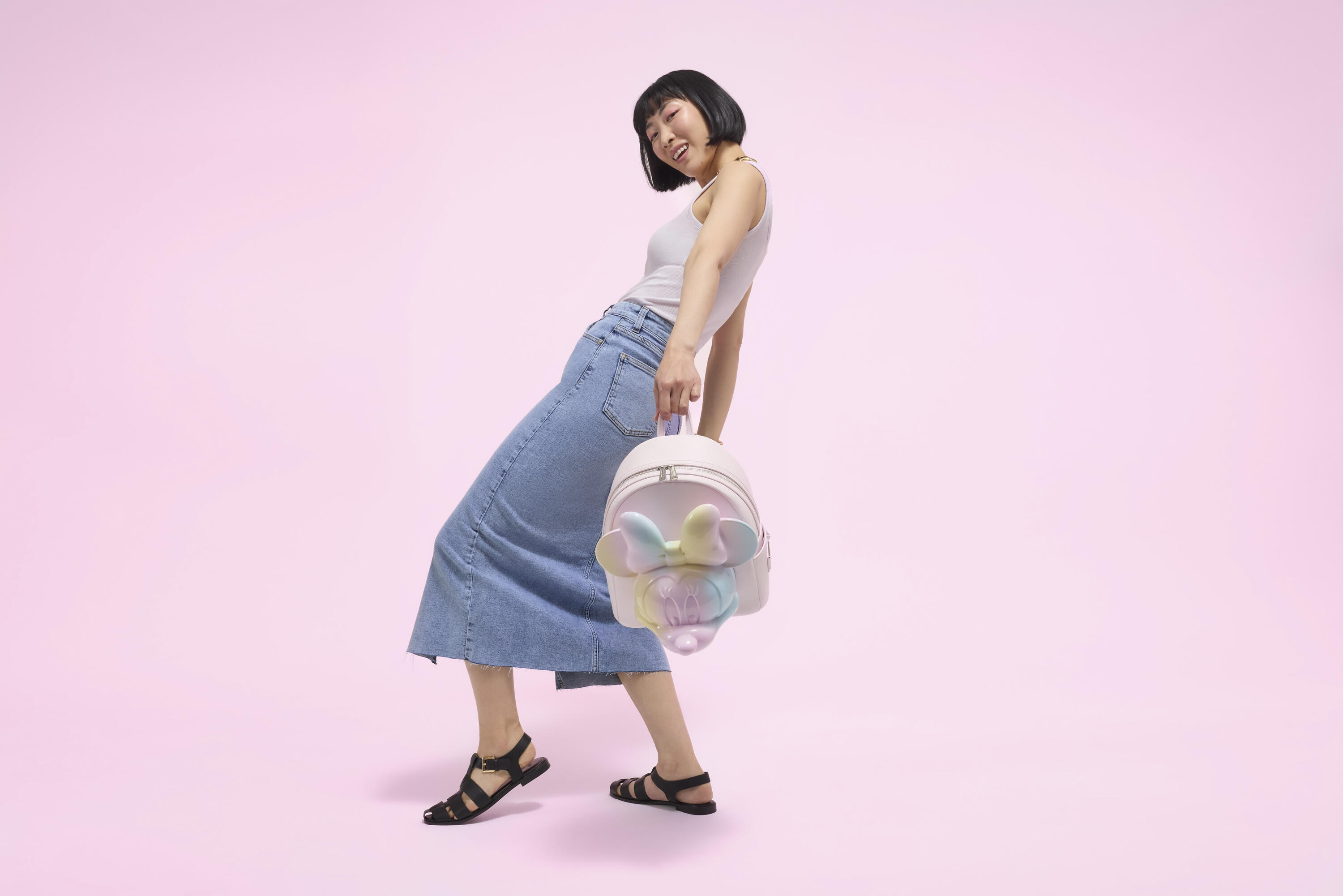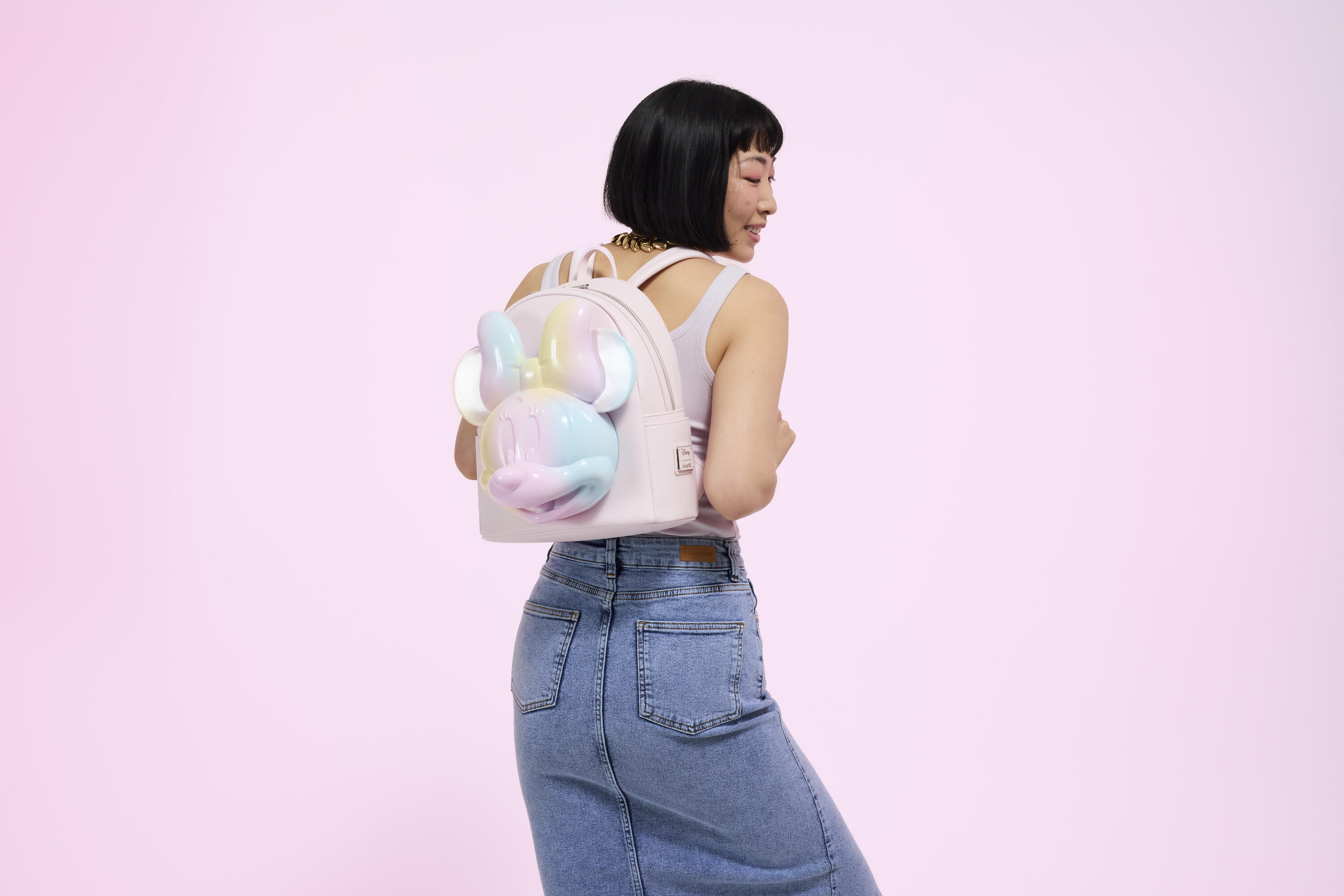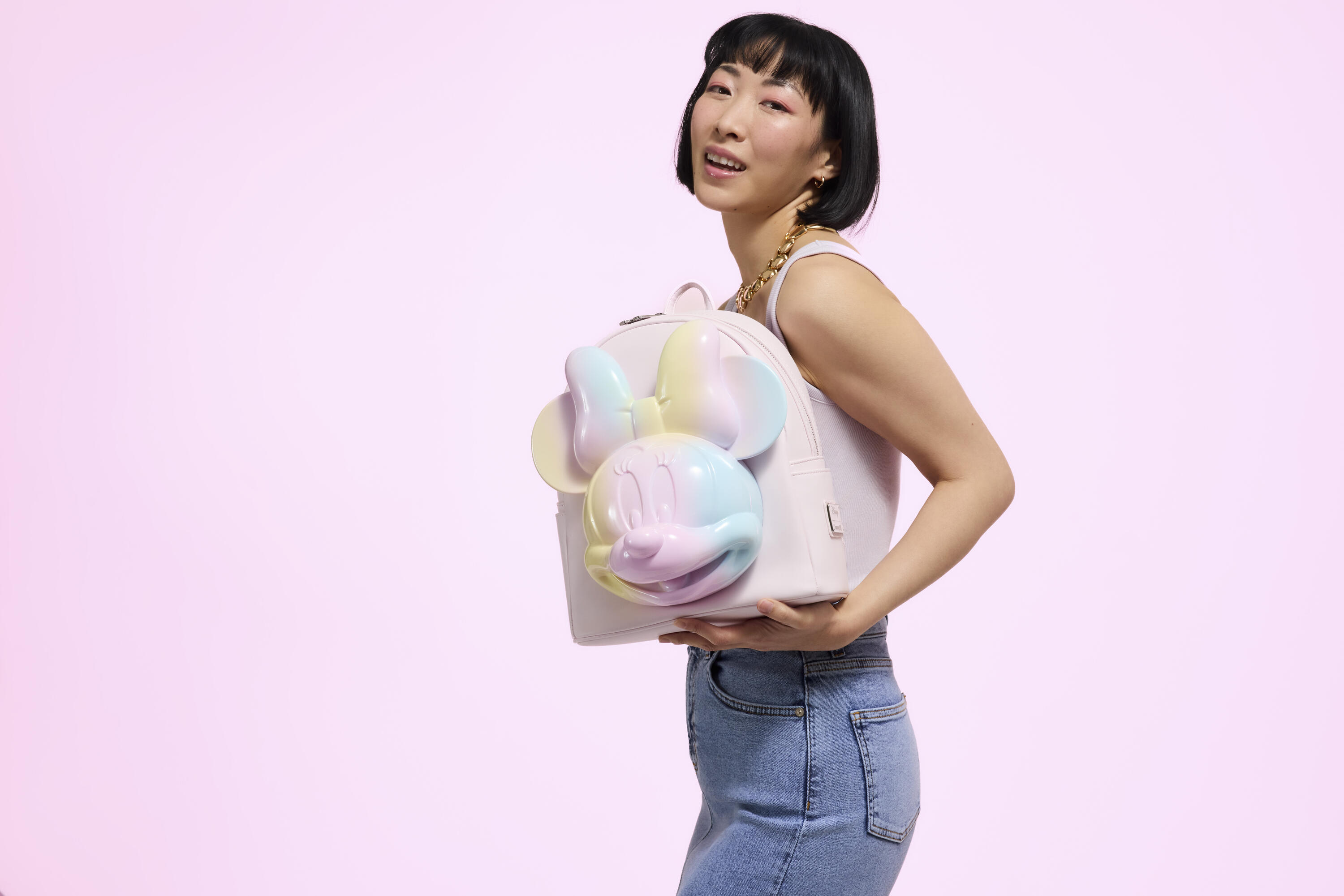 Ce sac à dos est orné d'une tête de Minnie Mouse moulée en 3D ! Elle sourit à l'avant du sac. Minnie est décorée de motifs tie-dye pastel rose, bleu et jaune.
