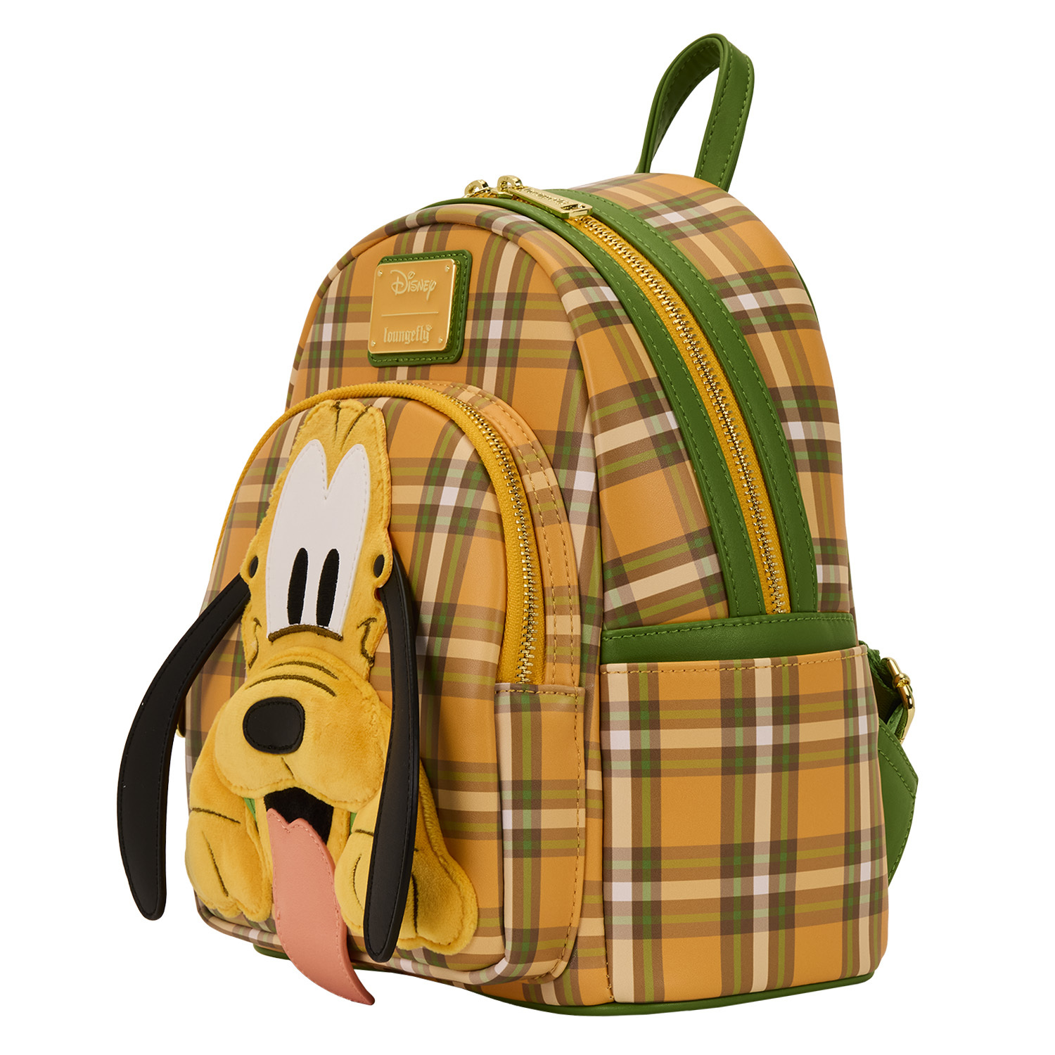 Ce sac est entièrement orné d'un motif écossais jaune et vert. Sur la poche avant, vous trouverez Pluto souriant, et ses oreilles bougent de haut en bas sur un rivet ! Retournez le sac pour découvrir une image de Pluto traînant dans sa niche. Les bretelles sont gravées de l'inscription « Good Boy ».