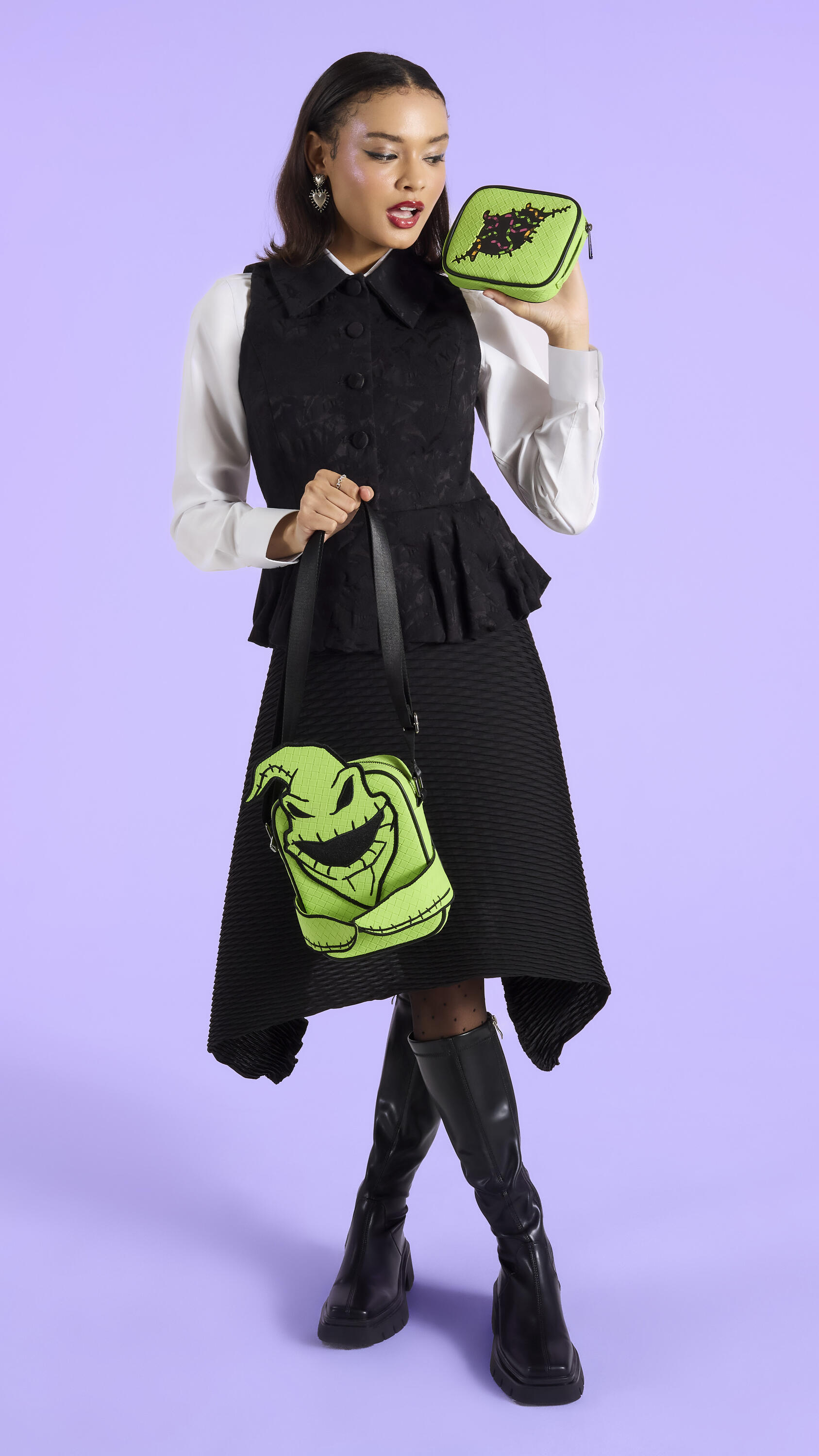 Ce sac bandoulière est orné d'une applique d' Oogie Boogie sur le devant et au centre. Ses deux bras s'enroulent autour d'une pochette amovible et réversible : d'un côté, des araignées et des vers, et de l'autre, des bestioles rampantes sortant d'une « larme ». Oh, et le meilleur ? Ce sac brille dans le noir !
