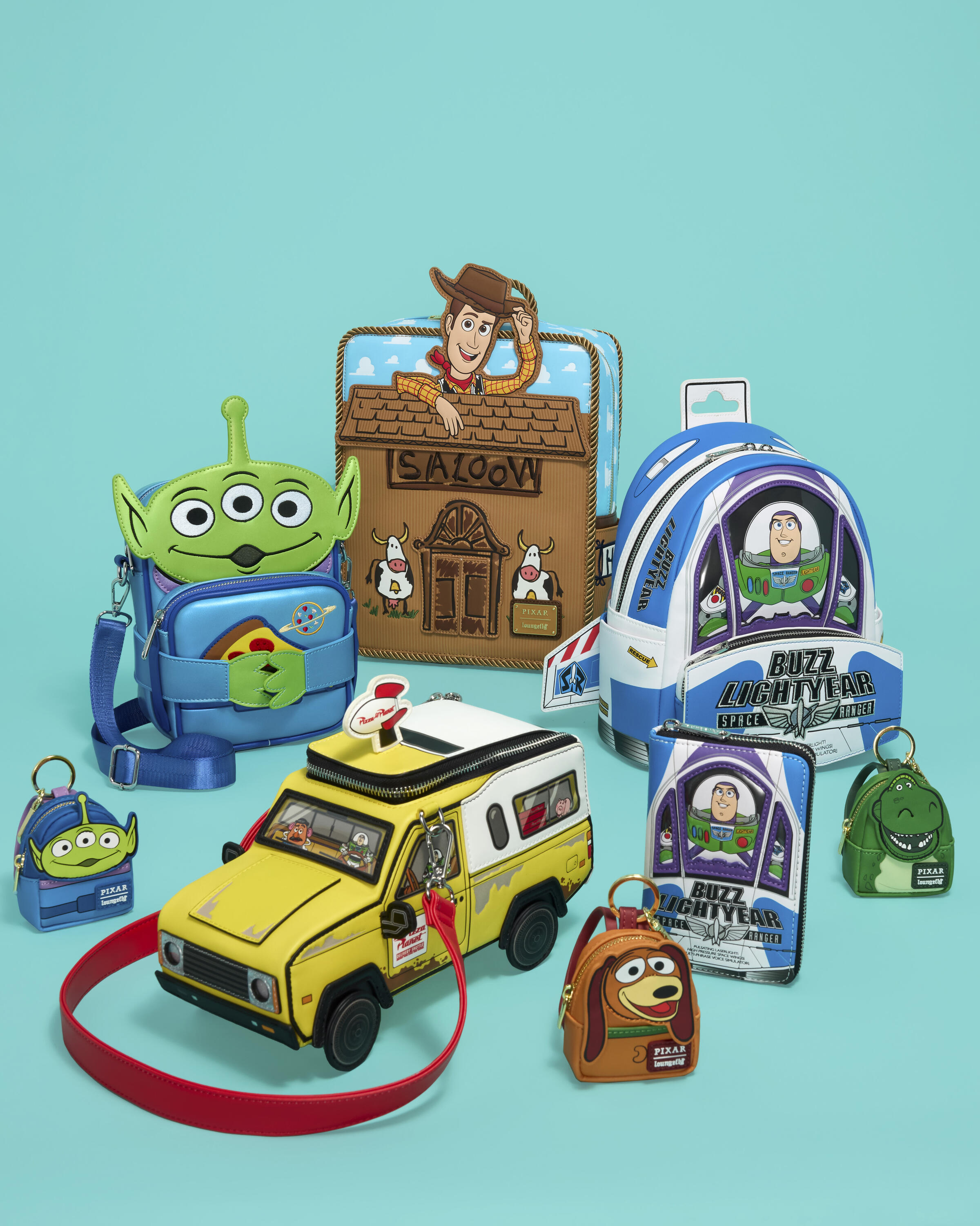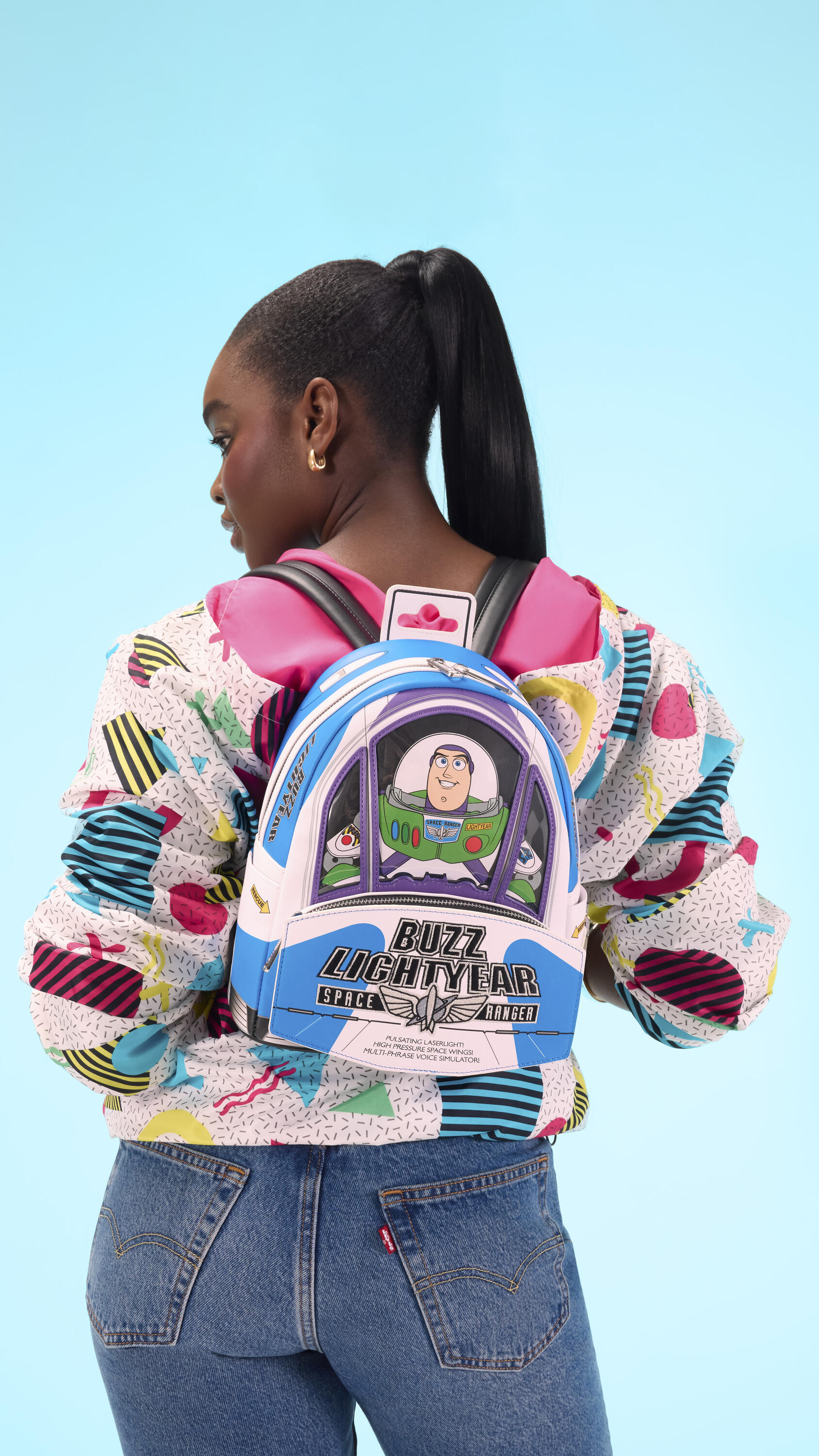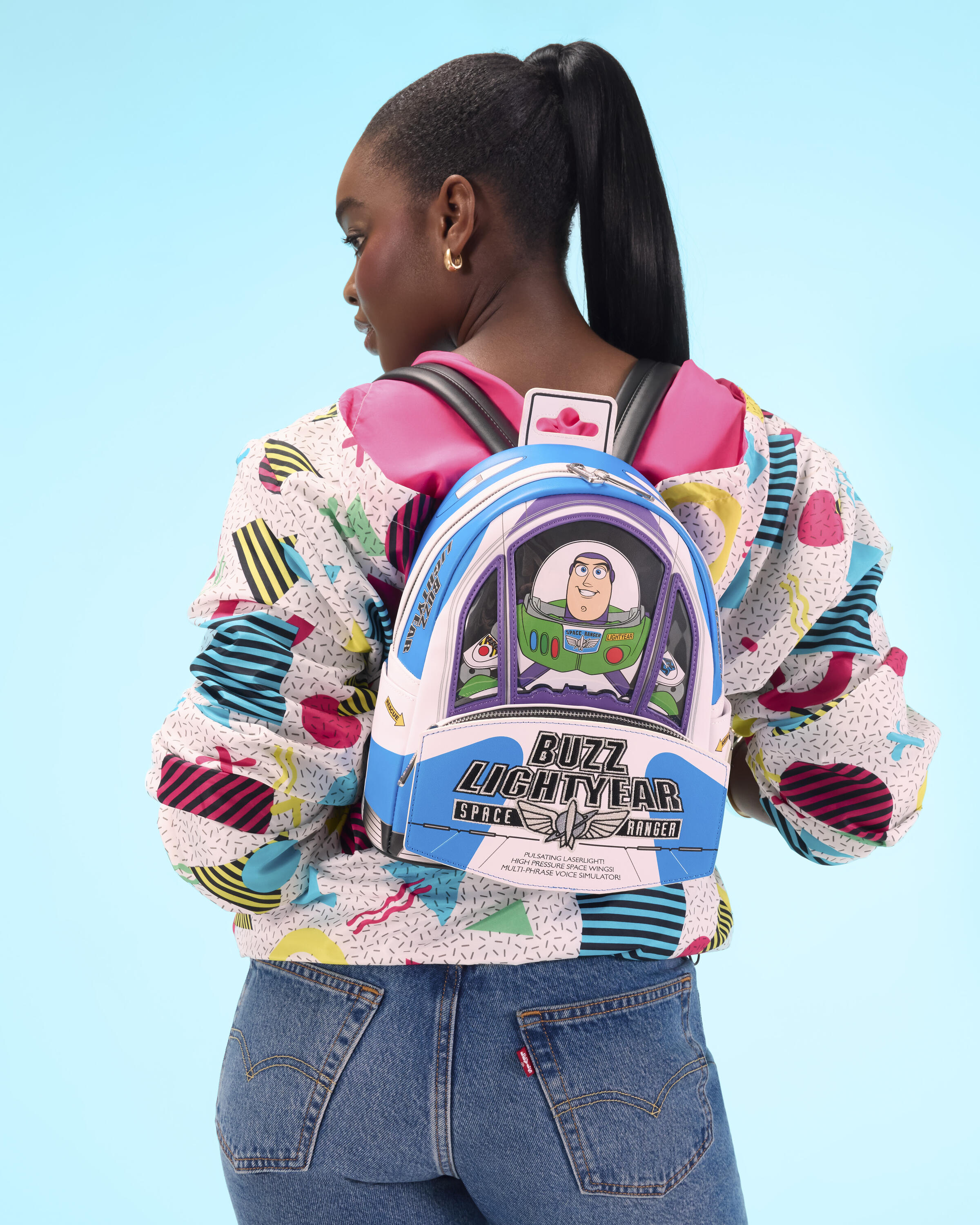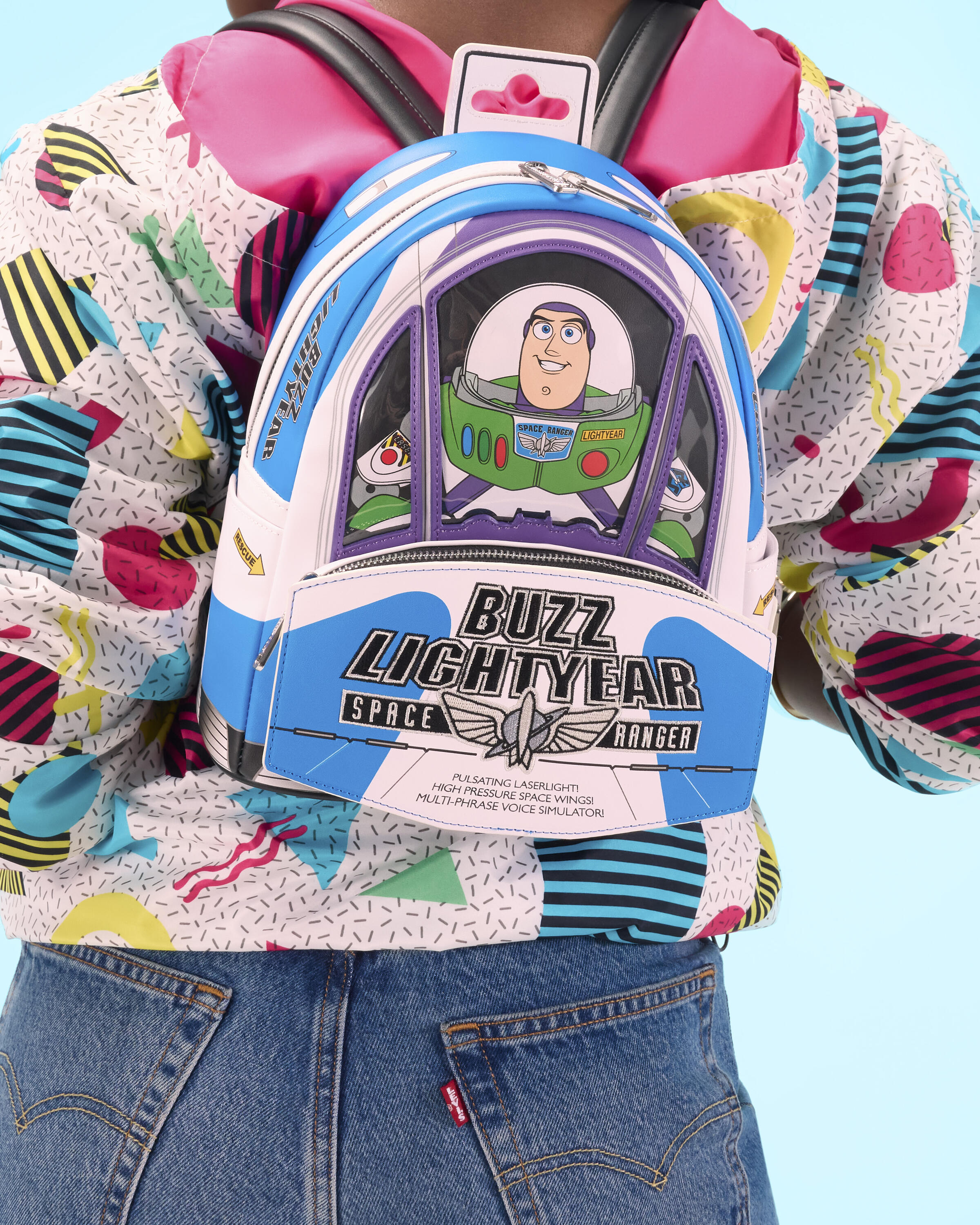 Ce sac reprend la forme de l'emballage de Buzz l'Éclair que l'on voit dans le film ; il ressemble à son vaisseau spatial avec des ailes qui dépassent sur le côté et du PVC transparent sur le devant, à travers lequel on peut voir Buzz l'Éclair. Pour le rendre encore plus spécial, ce sac émet des sons et brille dans le noir !