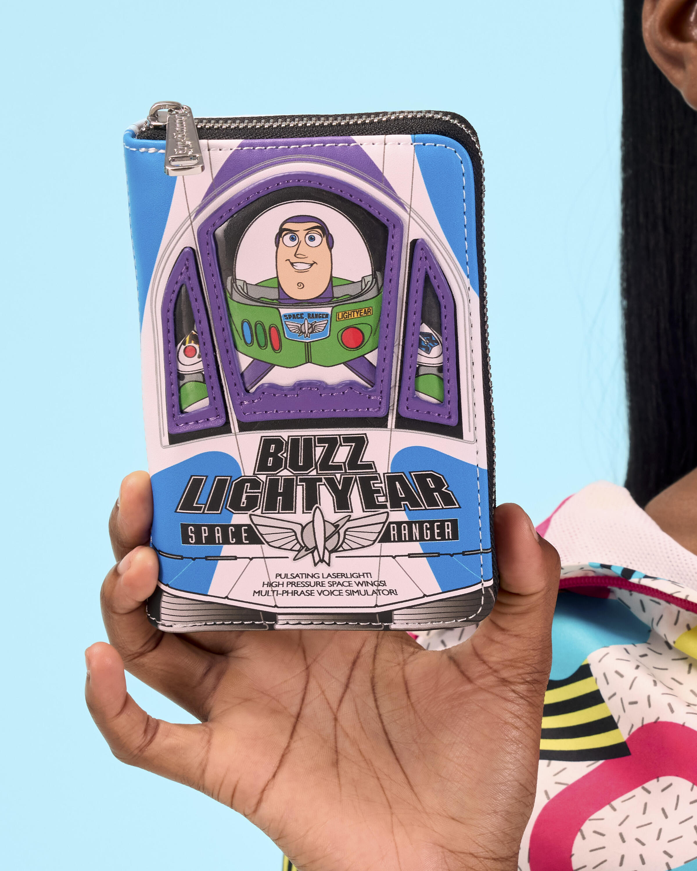 Le design de ce portefeuille ressemble à l'emballage de Buzz l'Éclair. Vous y trouverez des détails en relief, brodés et en PVC. De plus, le portefeuille brille dans le noir ! À l'intérieur, il y a quatre emplacements pour cartes et un emplacement transparent pour une pièce d'identité.