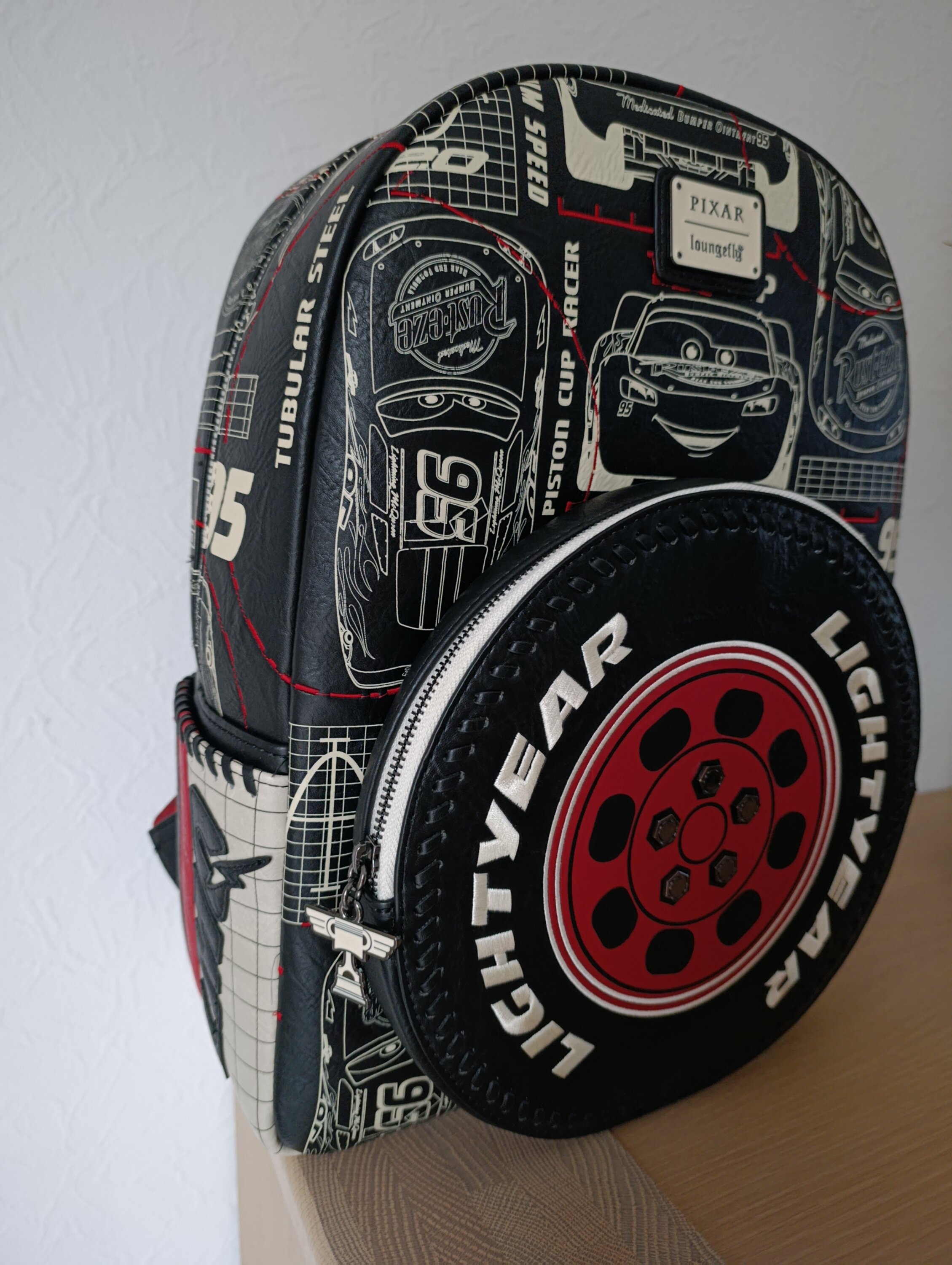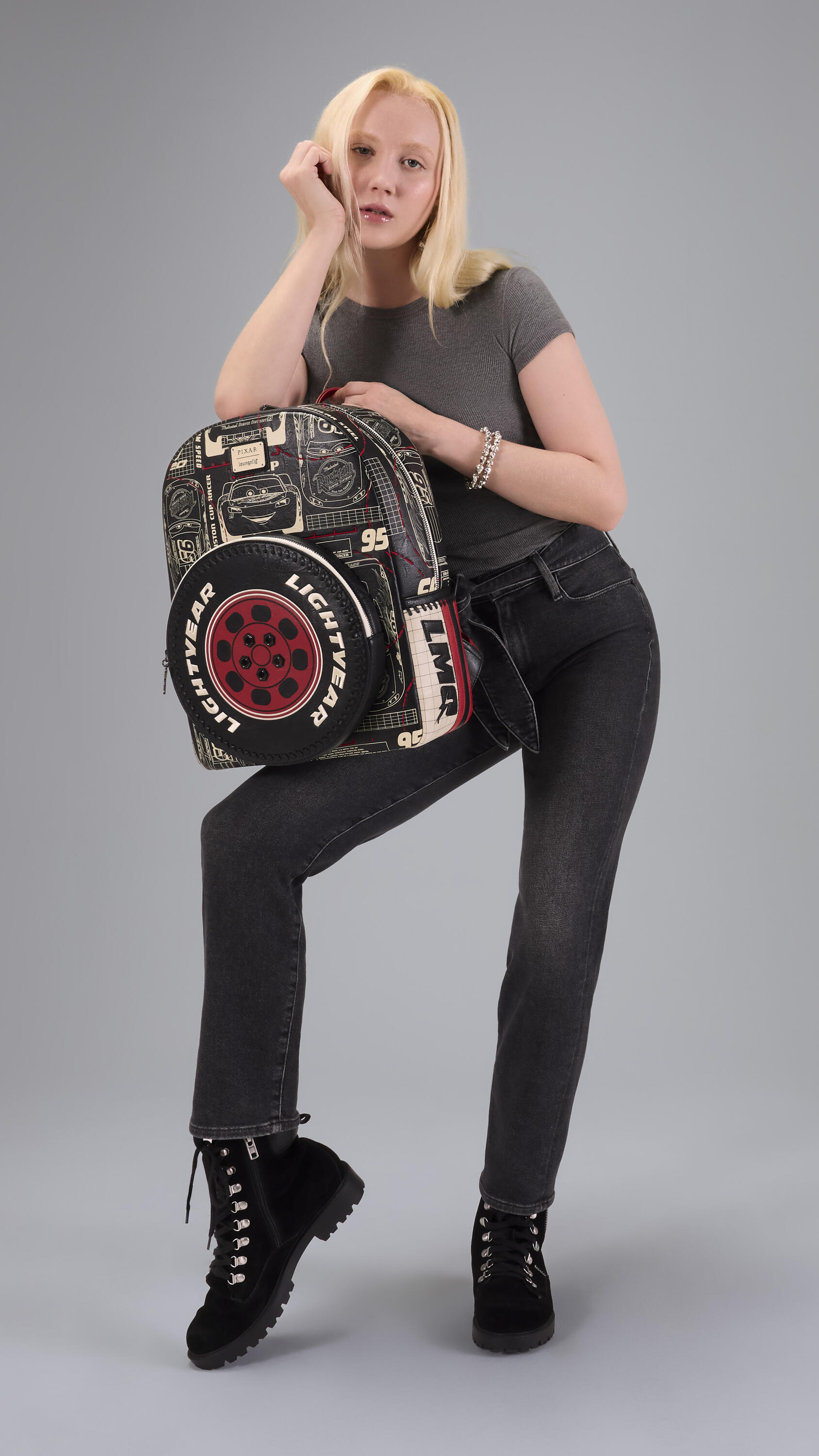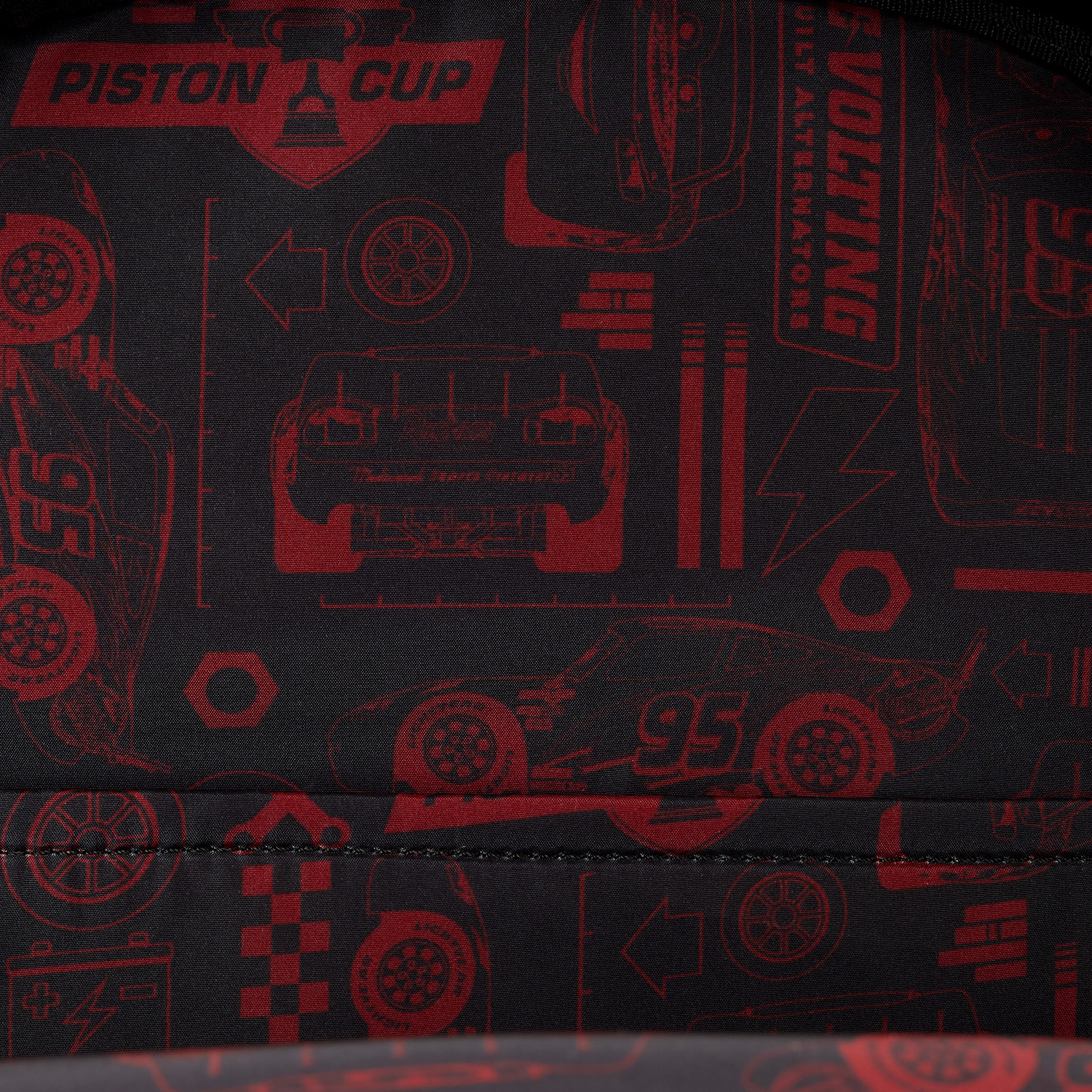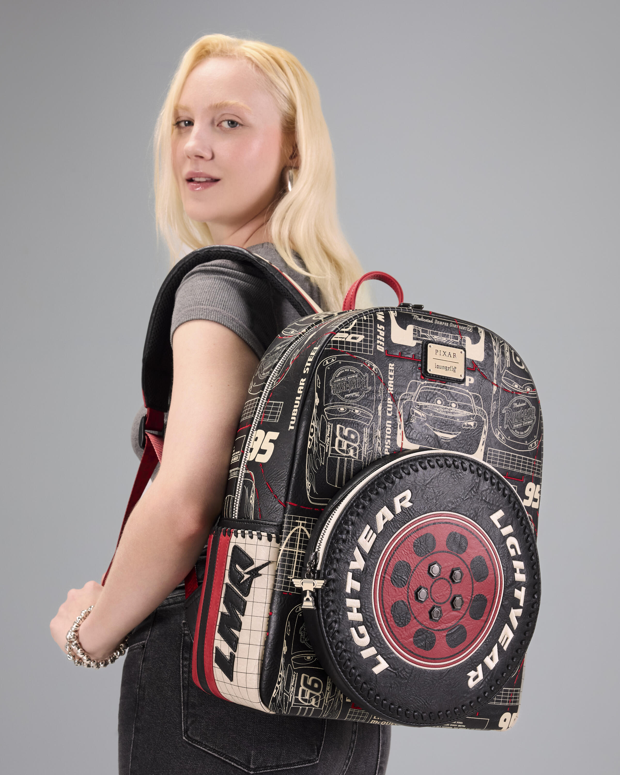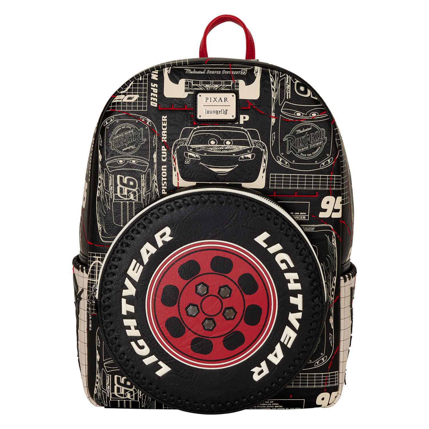 Ce sac à dos grand format présente différentes images des personnages de Cars en blanc sur fond noir. La poche avant a la forme d'un pneu avec l'inscription « Lightyear » sur le côté, et des rivets métalliques moulés au centre ! Les bretelles sont mi-blanches, mi-rouges et arborent une applique du numéro « 95 ».