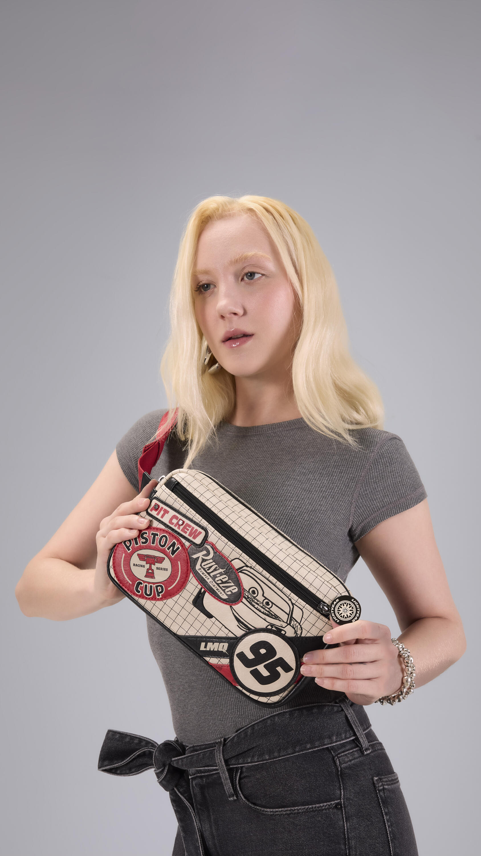 Ce sac bandoulière est doté d'un similicuir patiné, de clous métalliques moulés et de détails brodés imitant des autocollants sur le devant. Vous y trouverez des autocollants avec les mots « Pit Crew », « Rust-eze », « Piston Cup » et bien plus encore ! Ce sac est un accessoire vraiment amusant, à la fois élégant et idéal pour célébrer l'un de vos films préférés !