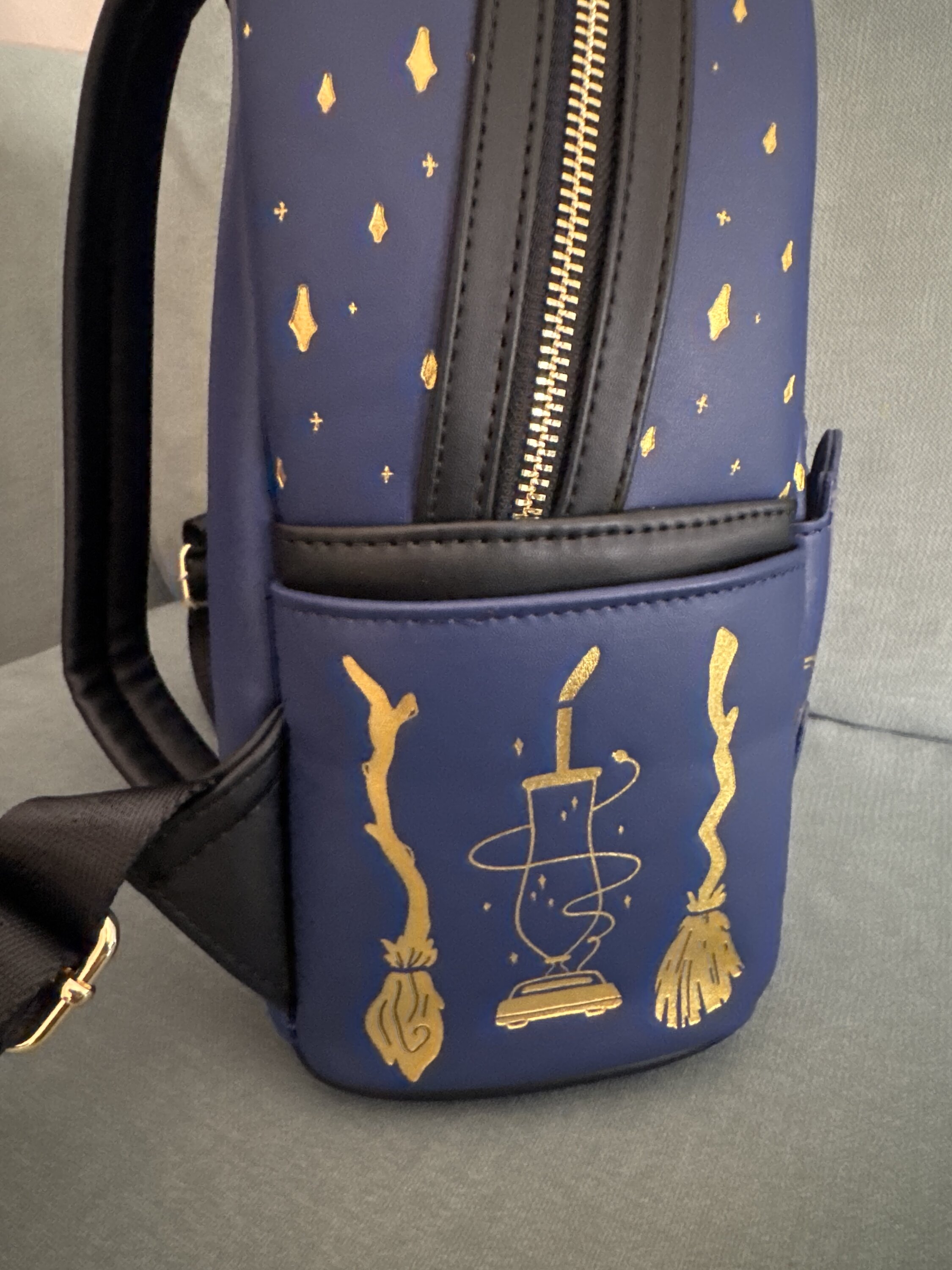 Ce mini sac à dos représente les sœurs Sanderson du film Hocus Pocus de Disney. Elles dansent ensemble sous un ciel étoilé dans un cimetière. Binx surgit de derrière une pierre tombale ! Sur les poches latérales, vous trouverez des détails en feuille d'or de chacun de leurs balais.