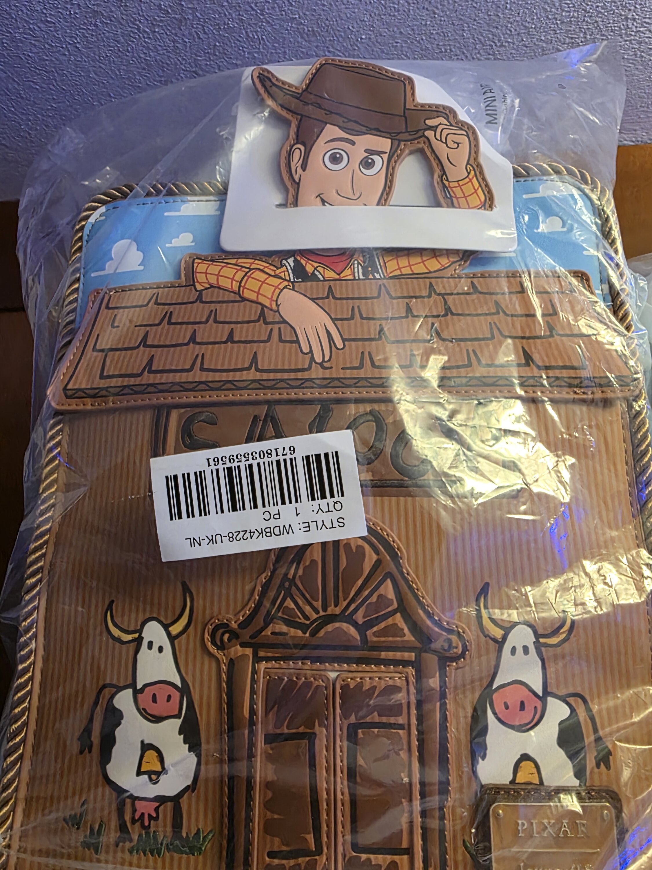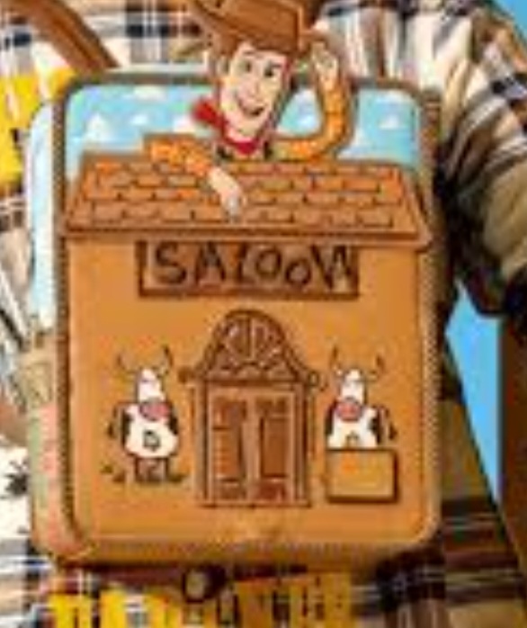 Ce mini sac à dos ressemble au saloon de Woody, fabriqué à partir d'une boîte en carton. Vous y trouverez l'écriture d'Andy indiquant « Saloon », « Banque » et « Hôtel ». Les détails en corde véritable et le similicuir cowboy le rendent encore plus amusant. De plus, Woody se penche au-dessus du saloon ! Les portes d'entrée du saloon s'ouvrent pour révéler une affiche de recherche.