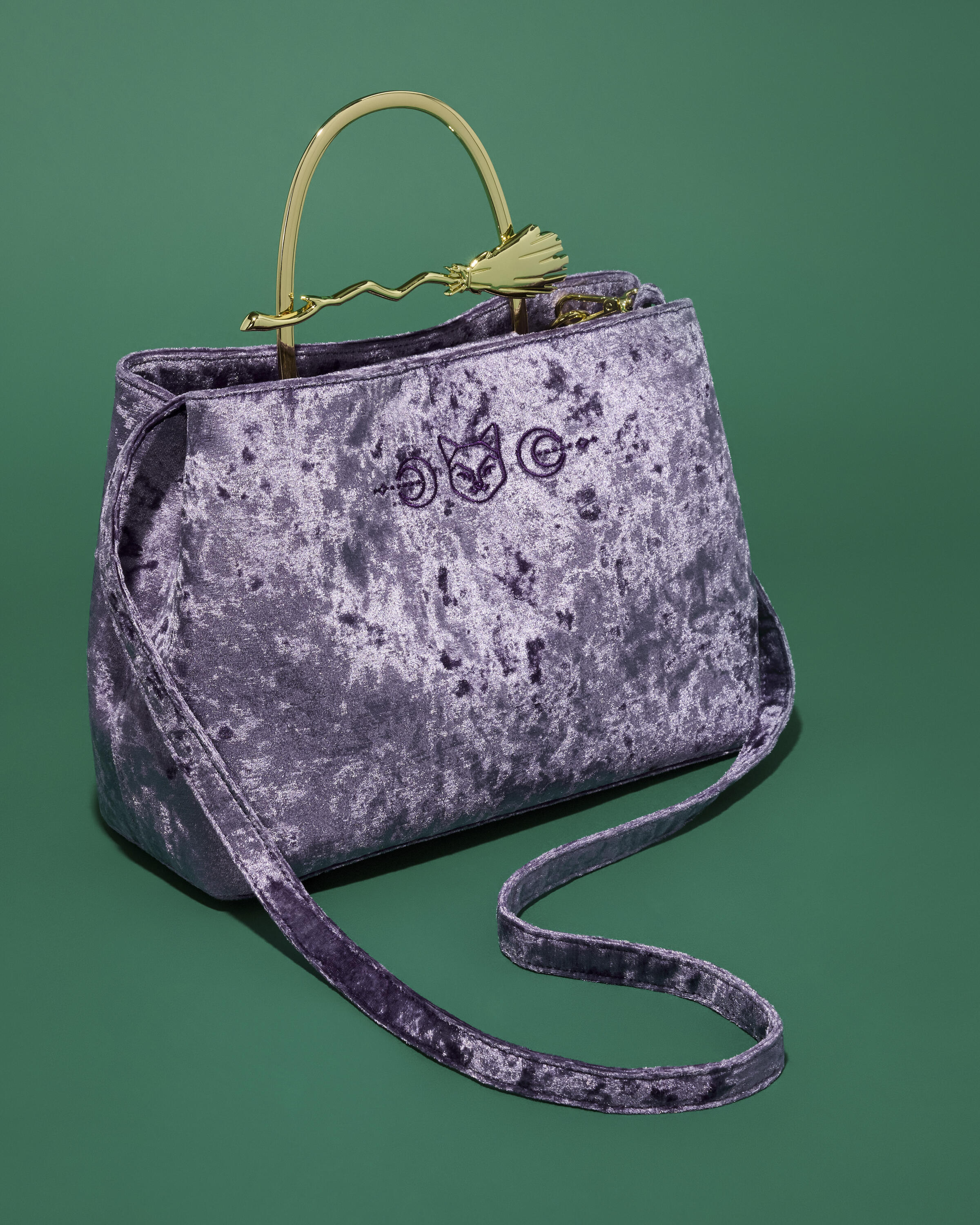 Ce sac à main en velours violet est orné de garnitures en similicuir. Vous y trouverez des symboles brodés sur le devant : des croissants de lune et un chat. La poignée supérieure est en métal moulé doré et présente un balai de sorcière !