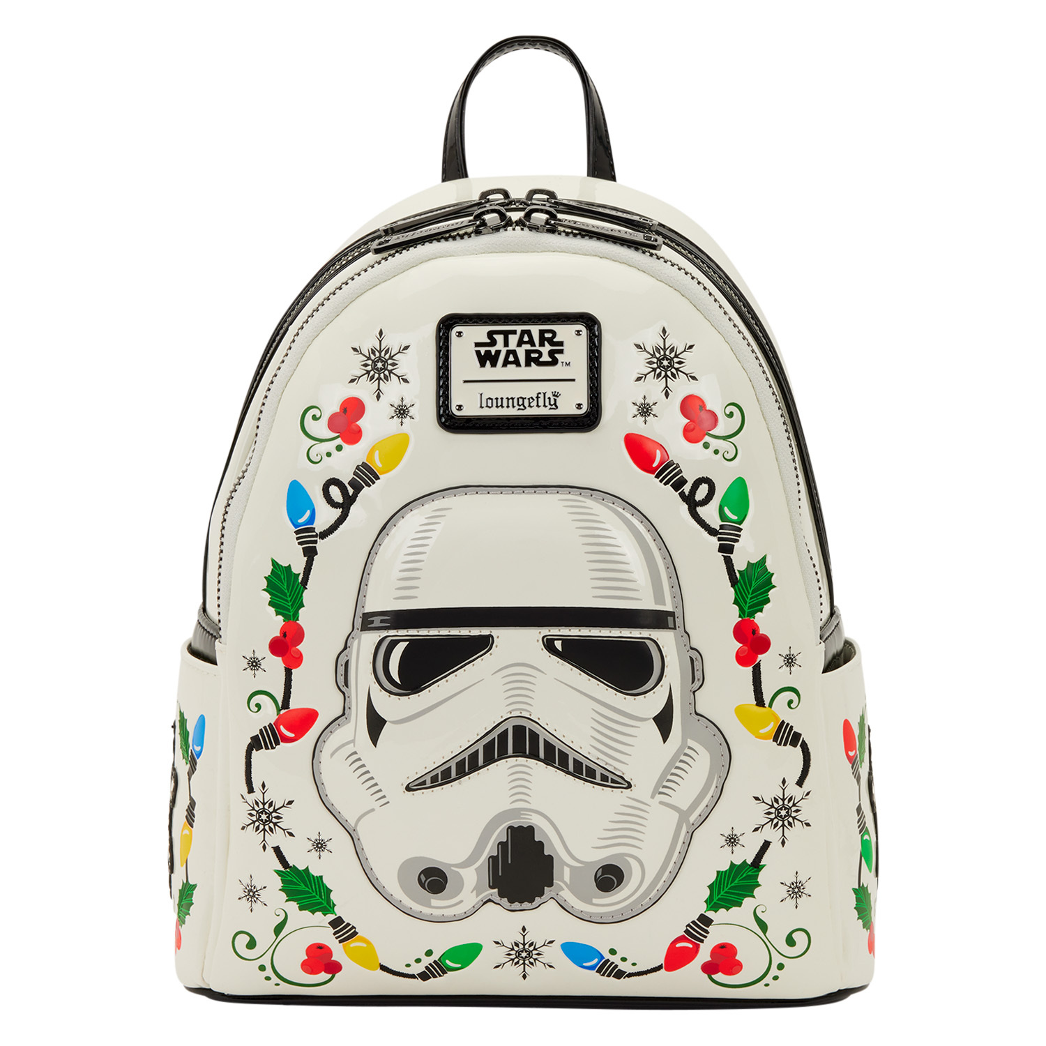 Ce mini sac à dos STAR WARS™ est prêt pour les fêtes ! Vous trouverez un casque de Stormtrooper au centre du sac, entouré de lumières de Noël brodées. Certaines lumières s'allument ! Le similicuir verni lui confère un éclat supplémentaire pour la saison. Vous trouverez davantage de motifs saisonniers sur la poche latérale et des flocons de neige appliqués sur les bretelles !