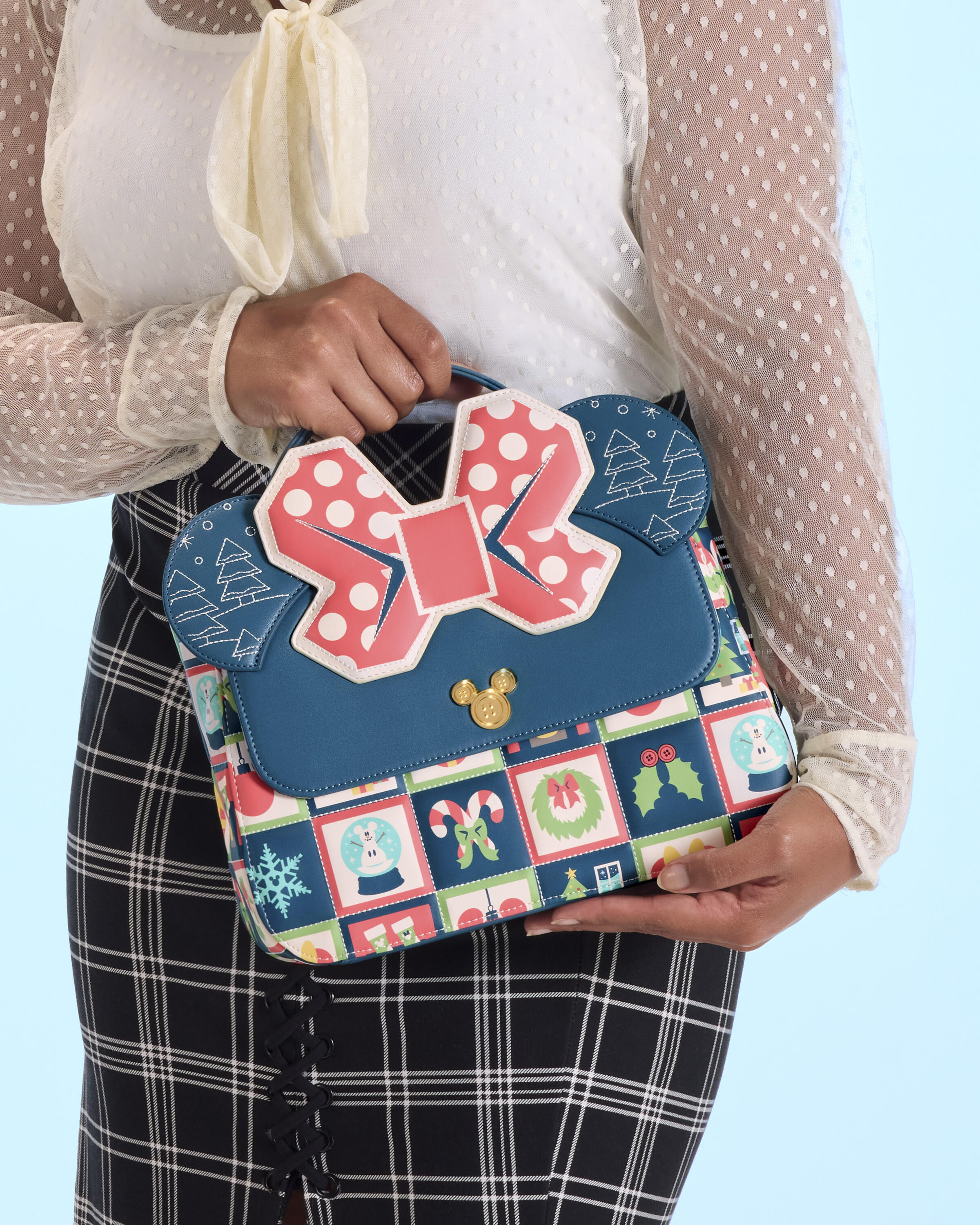 Ce sac bandoulière est inspiré de Minnie Mouse de Disney ! Vous y trouverez un motif intégral avec des motifs matelassés en relief de boules à neige, de cannes à sucre, de couronnes, de flocons de neige et bien plus encore. Vous trouverez un rivet en métal moulé à l'effigie de Mickey Mouse sur le rabat avant. Vous trouverez également des oreilles et un nœud Minnie appliqués sur le dessus !