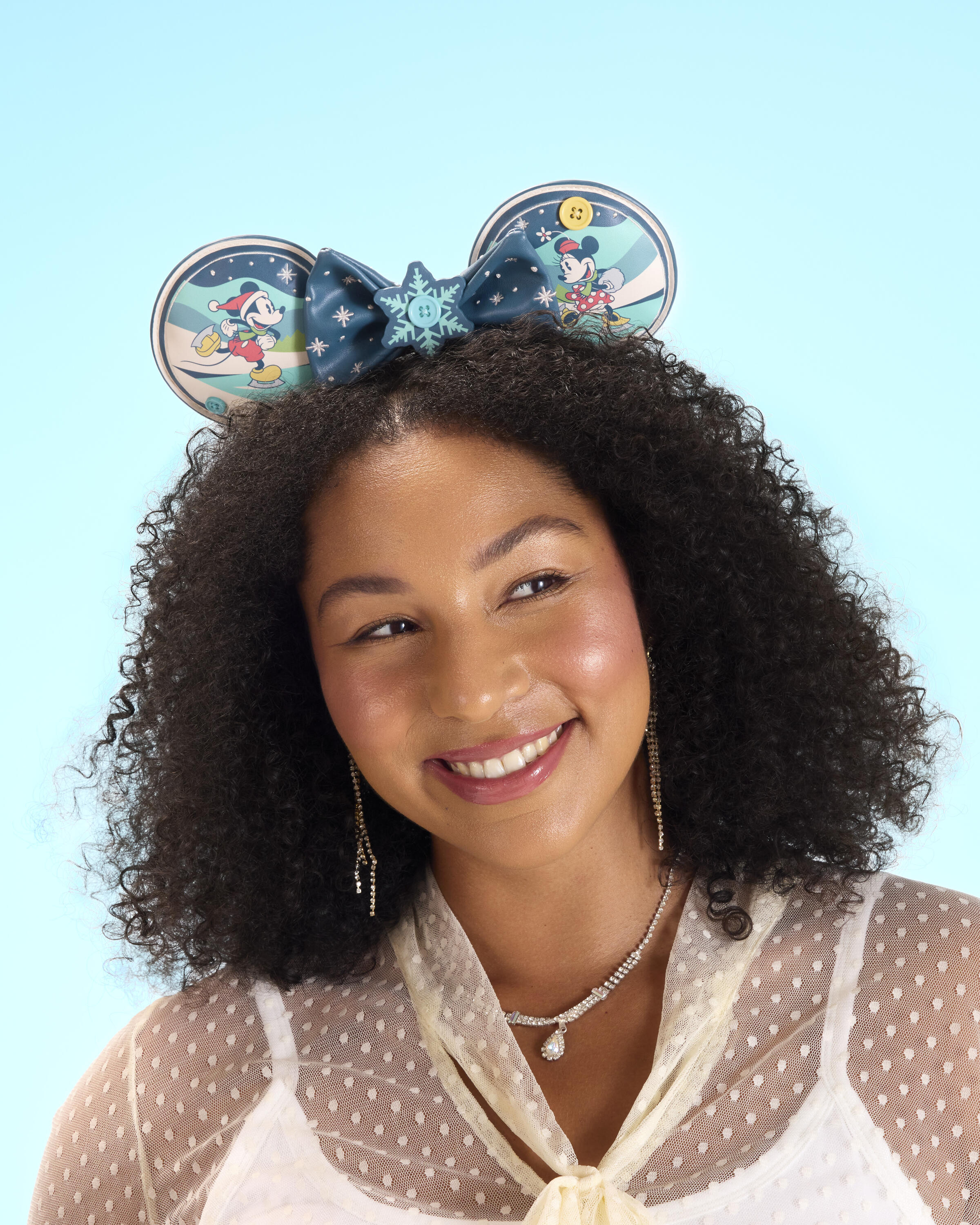 Ce serre-tête représente Mickey et Minnie en train de patiner. Un nœud amovible se trouve entre les oreilles, avec une breloque flocon de neige au centre et des étoiles sur le nœud. En le retournant, vous découvrirez un motif matelassé à l'arrière des oreilles, représentant des conifères.