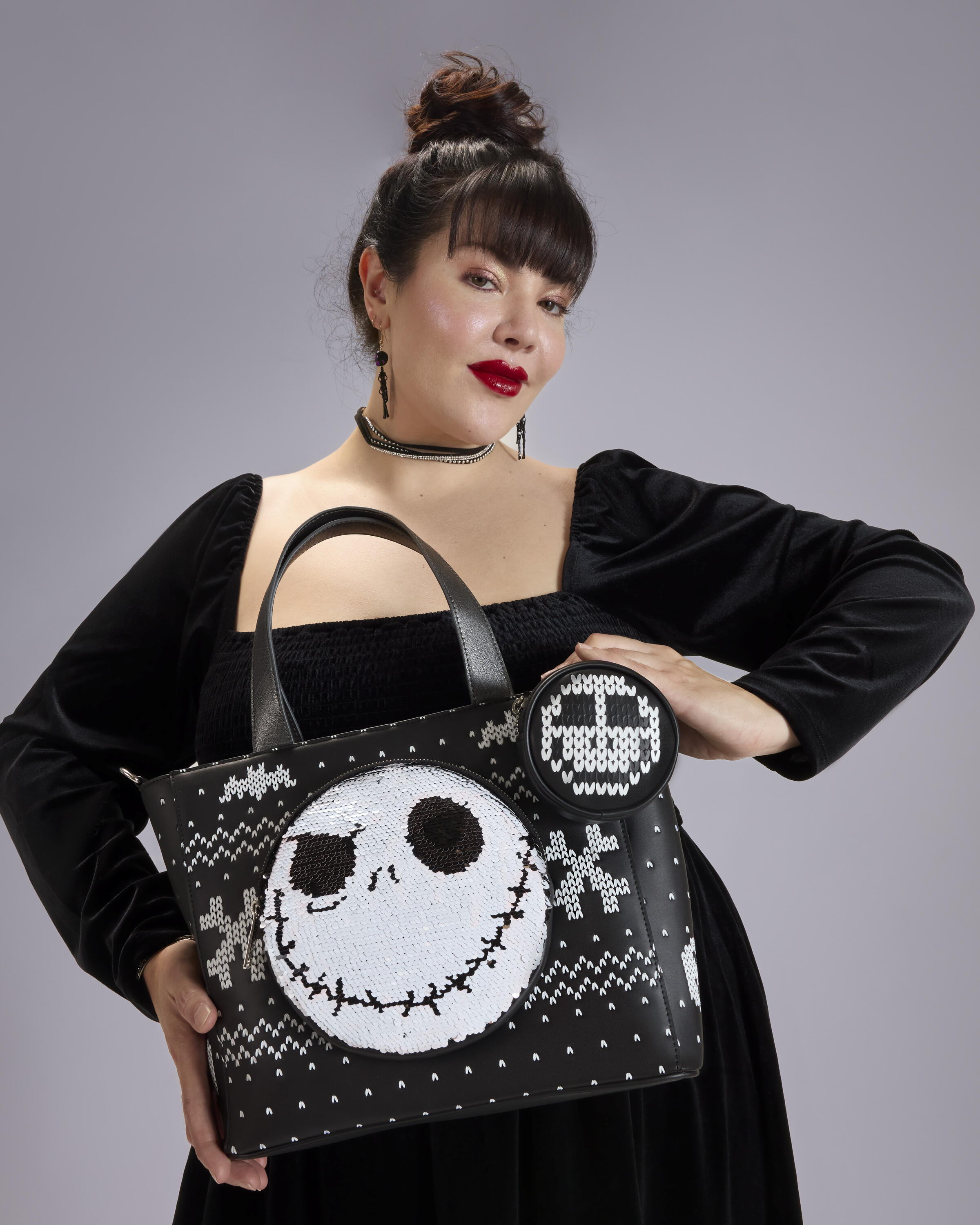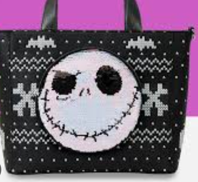 Ce sac fourre-tout est orné d'un motif inspiré d'un pull de Noël. Vous y trouverez des chauves-souris, des motifs en zigzag et l'inscription « Pumpkin King » au dos. Sur le devant, vous trouverez le visage de Jack Skellington en sequins. Les sequins sont réversibles : l'image se transforme alors en citrouille-lanterne ! Le porte-monnaie attaché à la bandoulière est assorti au motif de Jack sur le sac et peut également être utilisé comme citrouille d'Halloween !