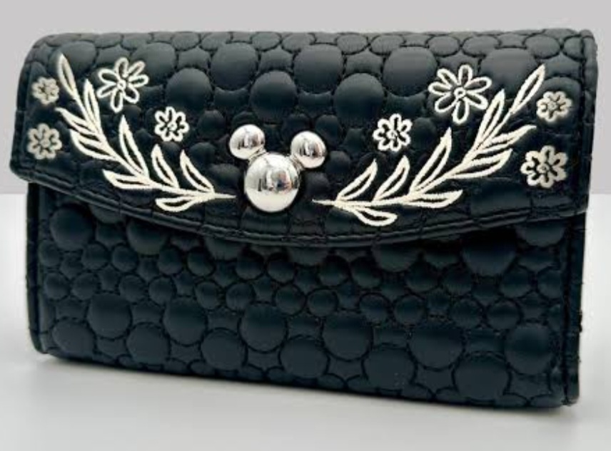 Ce portefeuille est orné d'un motif matelassé représentant des silhouettes de Mickey Mouse . Le rabat supérieur est agrémenté d'une breloque métallique en forme de silhouette de Mickey Mouse , encadrée de broderies florales et végétales. À l'intérieur, vous trouverez sept emplacements pour cartes et un emplacement transparent pour une carte d'identité. C'est l'accessoire Disney idéal pour vous accompagner tout au long de la journée !
