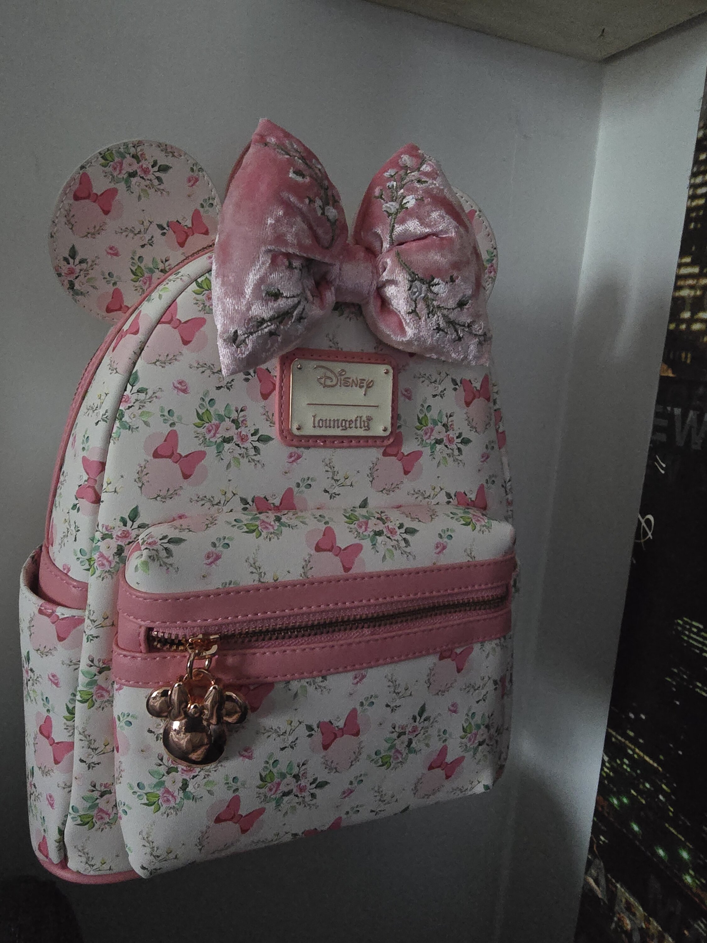 Ce mini sac à dos s'inspire de Minnie Mouse de Disney ! Il est orné d'oreilles en 3D avec un nœud en velours. Le reste du sac est recouvert d'un motif répété de silhouettes de Minnie Mouse entourées de motifs floraux. Les bretelles roses complètent parfaitement le look.