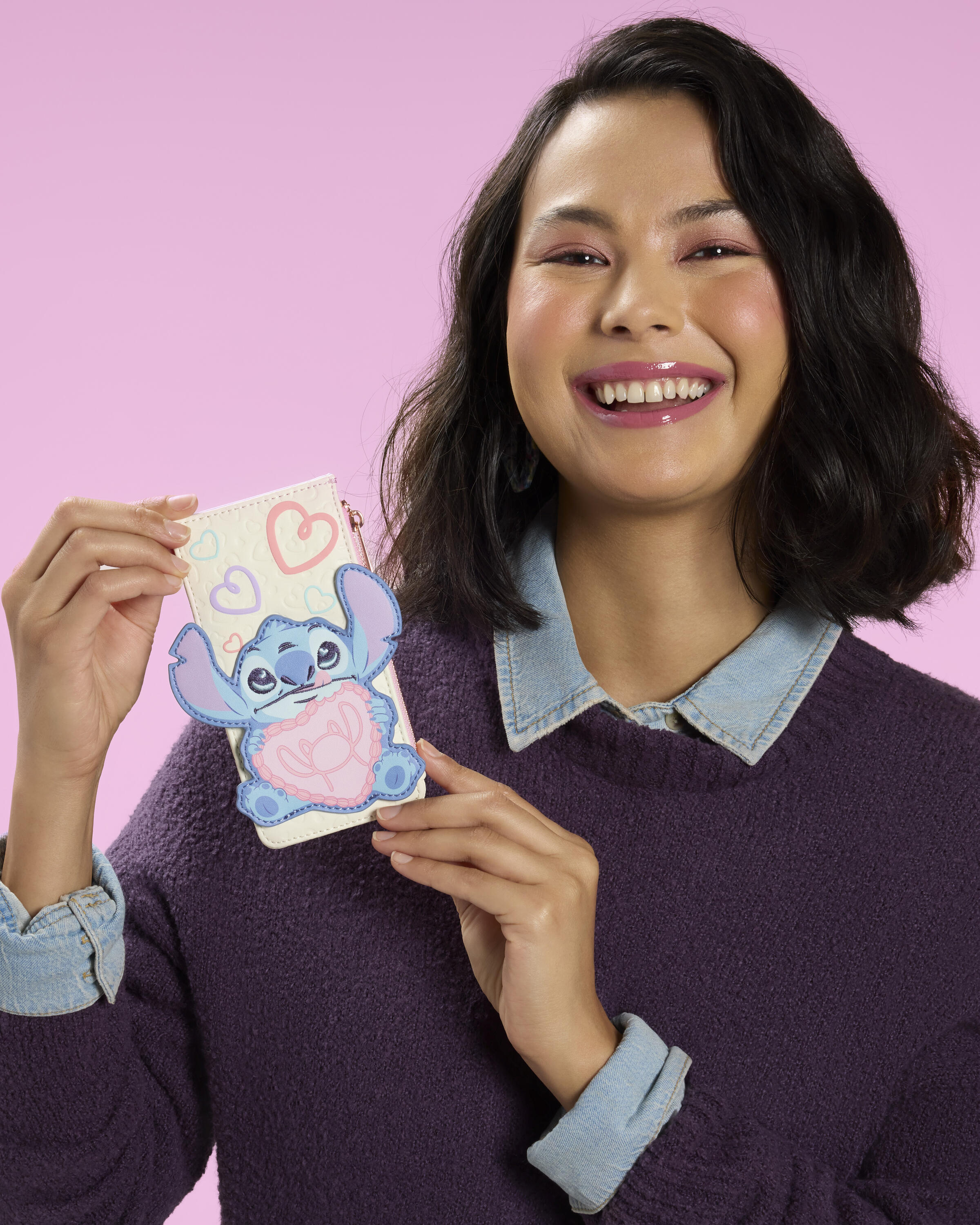Préparez-vous pour la Saint-valentin avec cet adorable porte-cartes Stitch . Stitch tient un gâteau en forme de cœur orné de la silhouette d'Angel. Le porte-cartes est orné d'un motif de cœurs en relief et en impression 3D. Retournez-le pour découvrir quatre emplacements pour cartes roses et bleus.