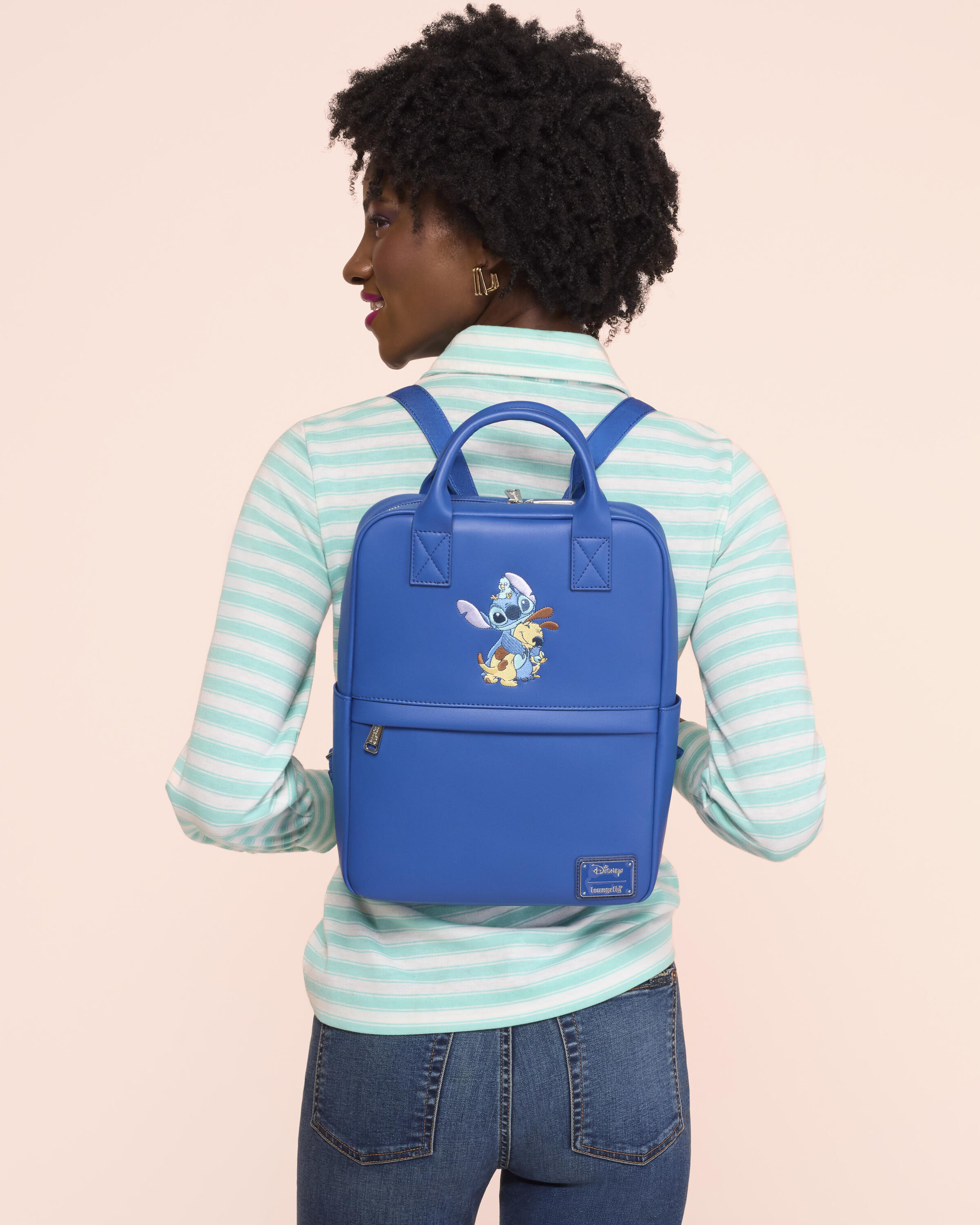 Ce sac à dos bleu de taille moyenne est orné d'imprimés représentant Stitch en train d'enlacer ses amis les animaux : un chien, un caneton et un oiseau. Il comprend une poche avant zippée, des poches latérales et un compartiment principal zippé. Il est prêt à accueillir vos essentiels pour toutes vos aventures !