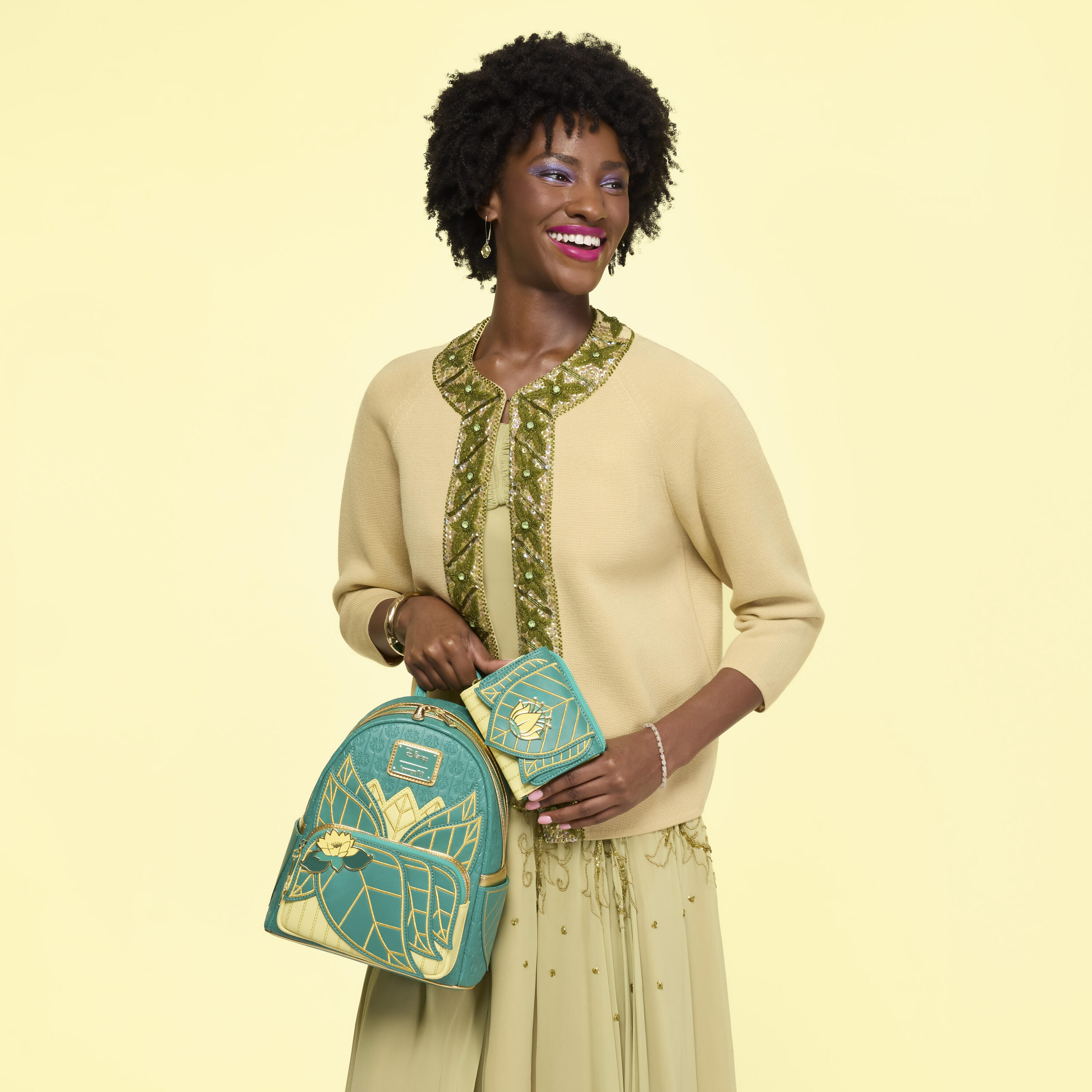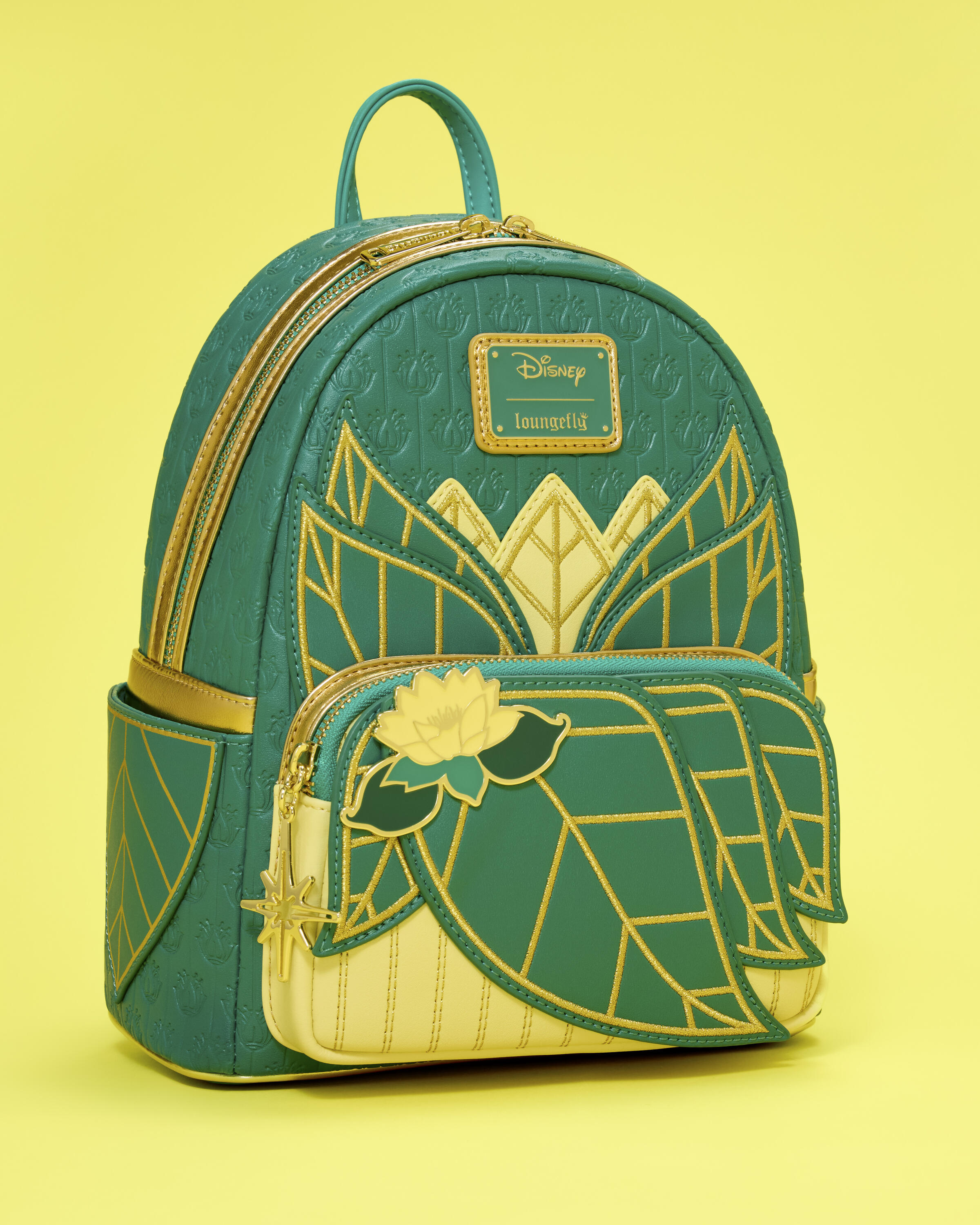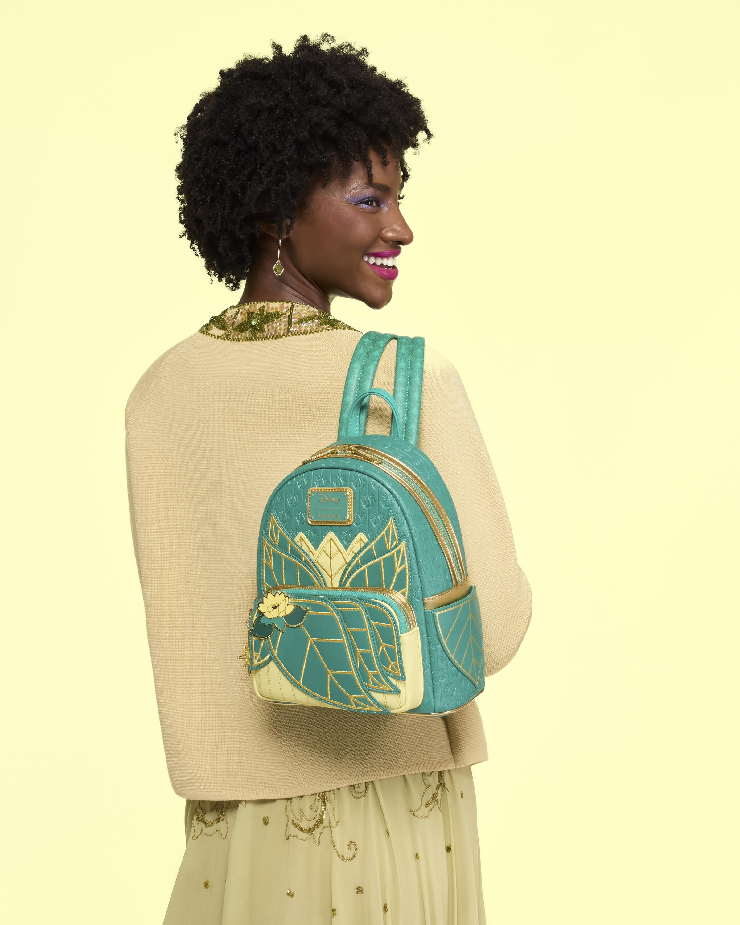 Ce mini sac à dos s'inspire de la robe verte de la princesse Tiana. Il est orné de broderies dorées métallisées, de rivets émaillés et de détails en relief. Des motifs de feuilles décorent les poches latérales et les bretelles sont également ornées de détails en relief. À l'intérieur, vous découvrirez une jolie doublure à l'effigie de Tiana, parfaitement assortie au reste du sac !