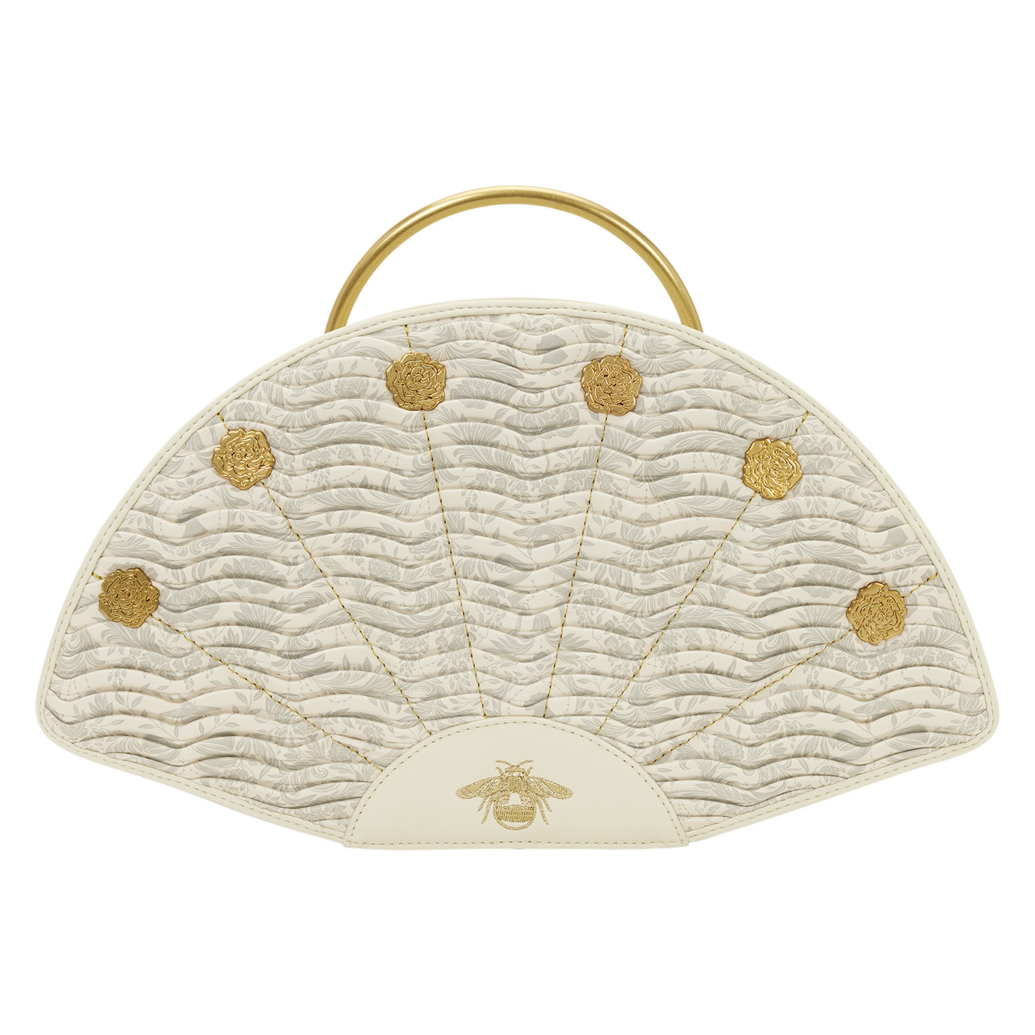 Ce sac à main en forme d'éventail est confectionné en matériel texturé. Rivets métalliques, broderies et anse dorée rehaussent son allure.