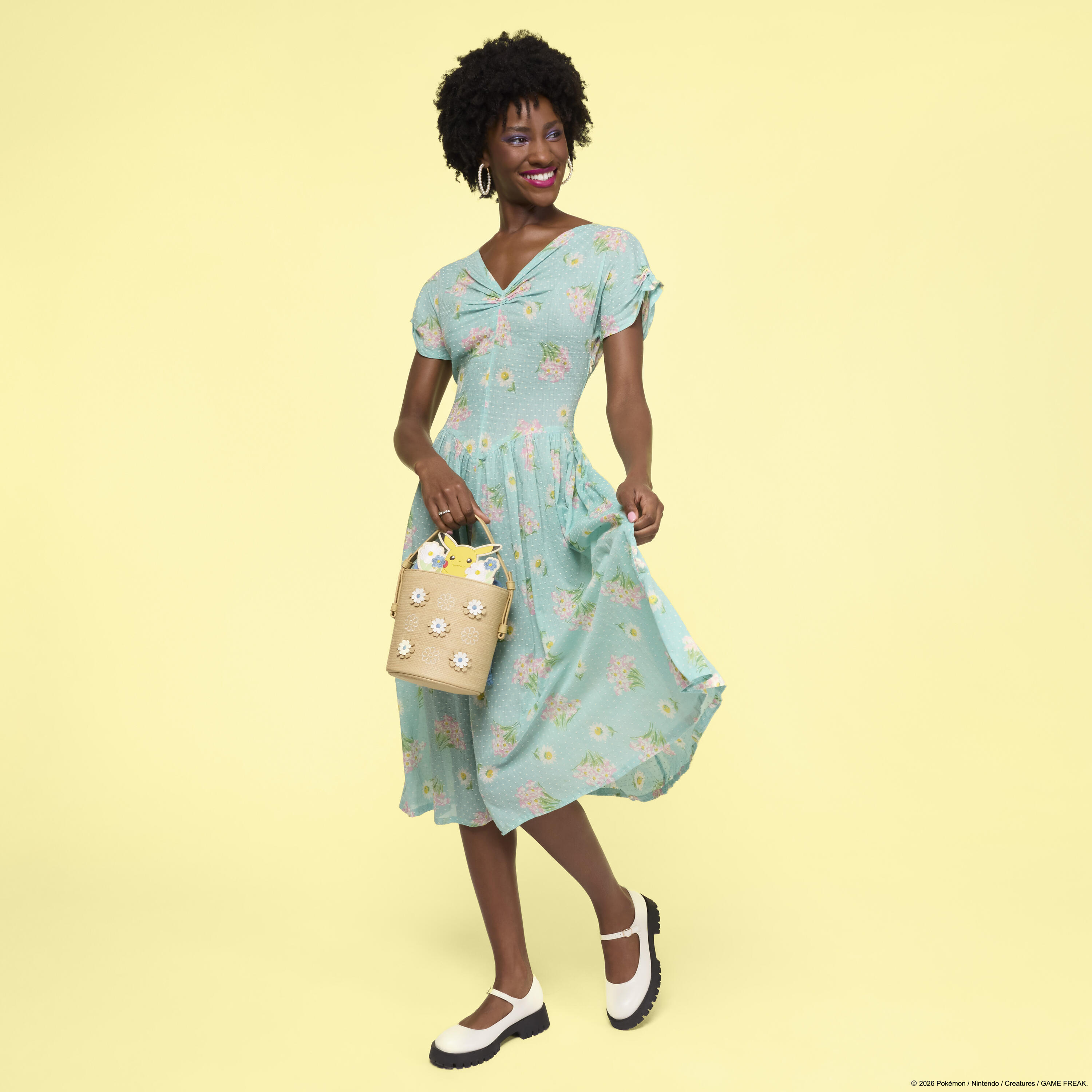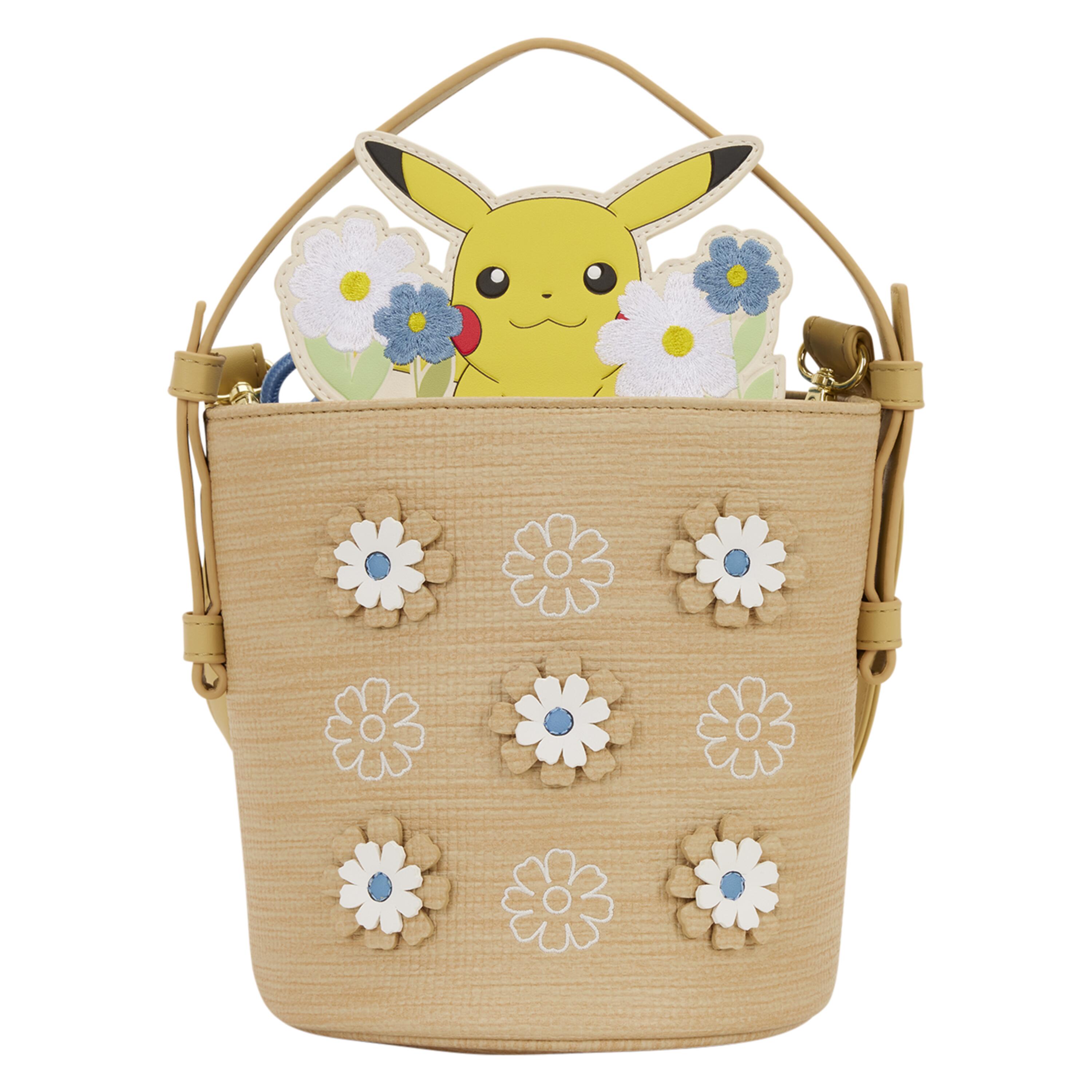 Ce sac ressemble à un panier tressé : il est orné de matériel tressé et d’appliqués floraux. D’autres fleurs et Pikachu dépassent du panier ! Un accessoire adorable pour transporter vos essentiels toute la journée !
