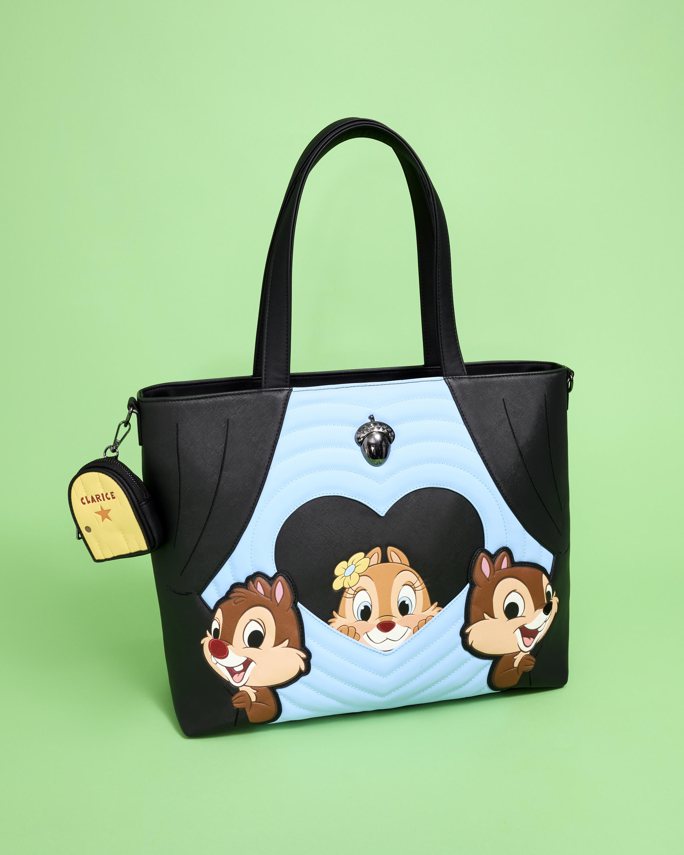 Ce sac tote s'inspire du court-métrage Tic et Tac. Clarice est représentée au centre, dans un cadre bleu en forme de cœur. Tic et Tac apparaissent de chaque côté d'elle, derrière des rideaux de théâtre noirs. Retournez le sac pour découvrir une autre image de Clarice au dos. matériel matelassée, appliqués rembourrés, polyuréthane doux et détails brodés confèrent à ce sac un charme unique. Une pochette à monnaie en forme de porte de loge de Clarice est fixée à la bandoulière.