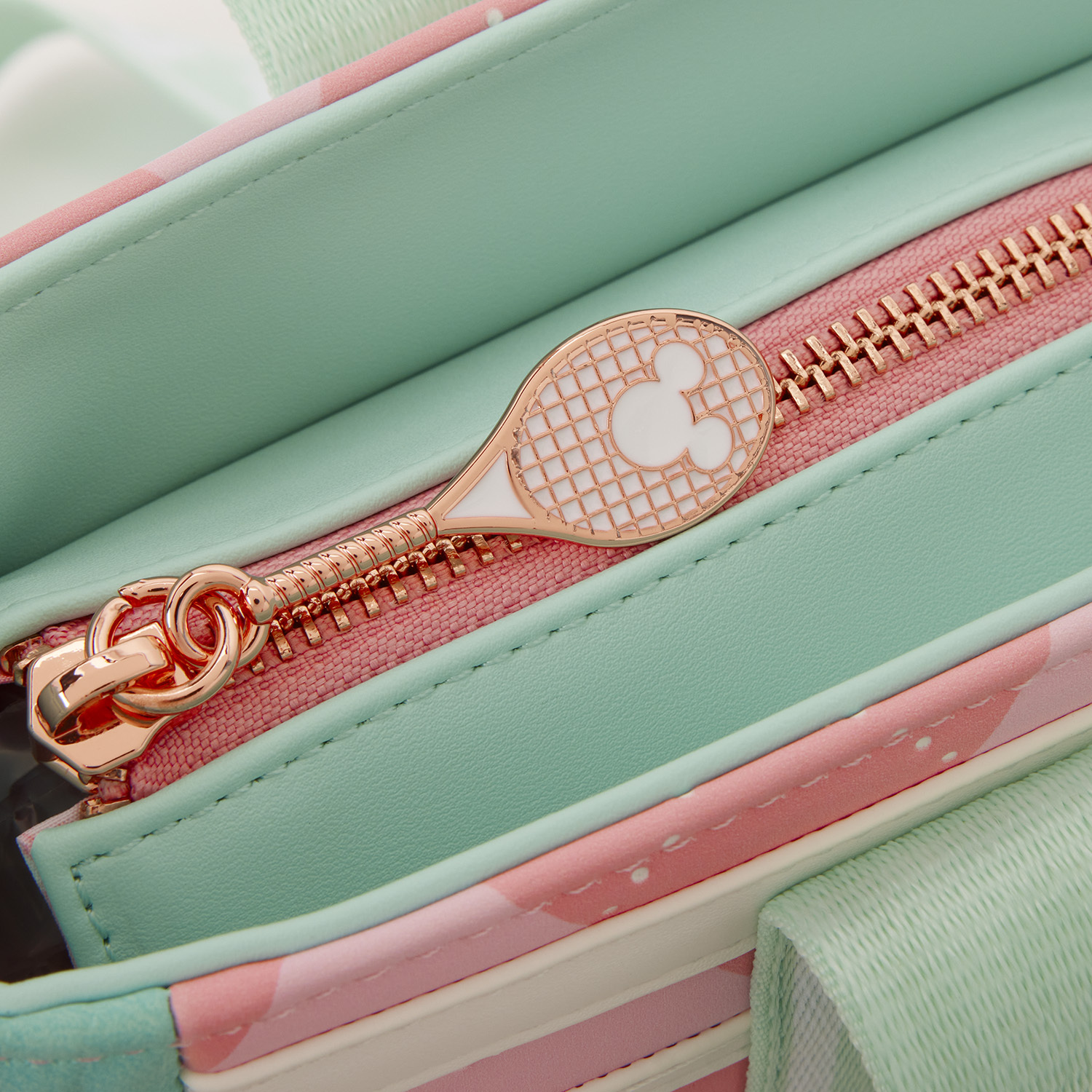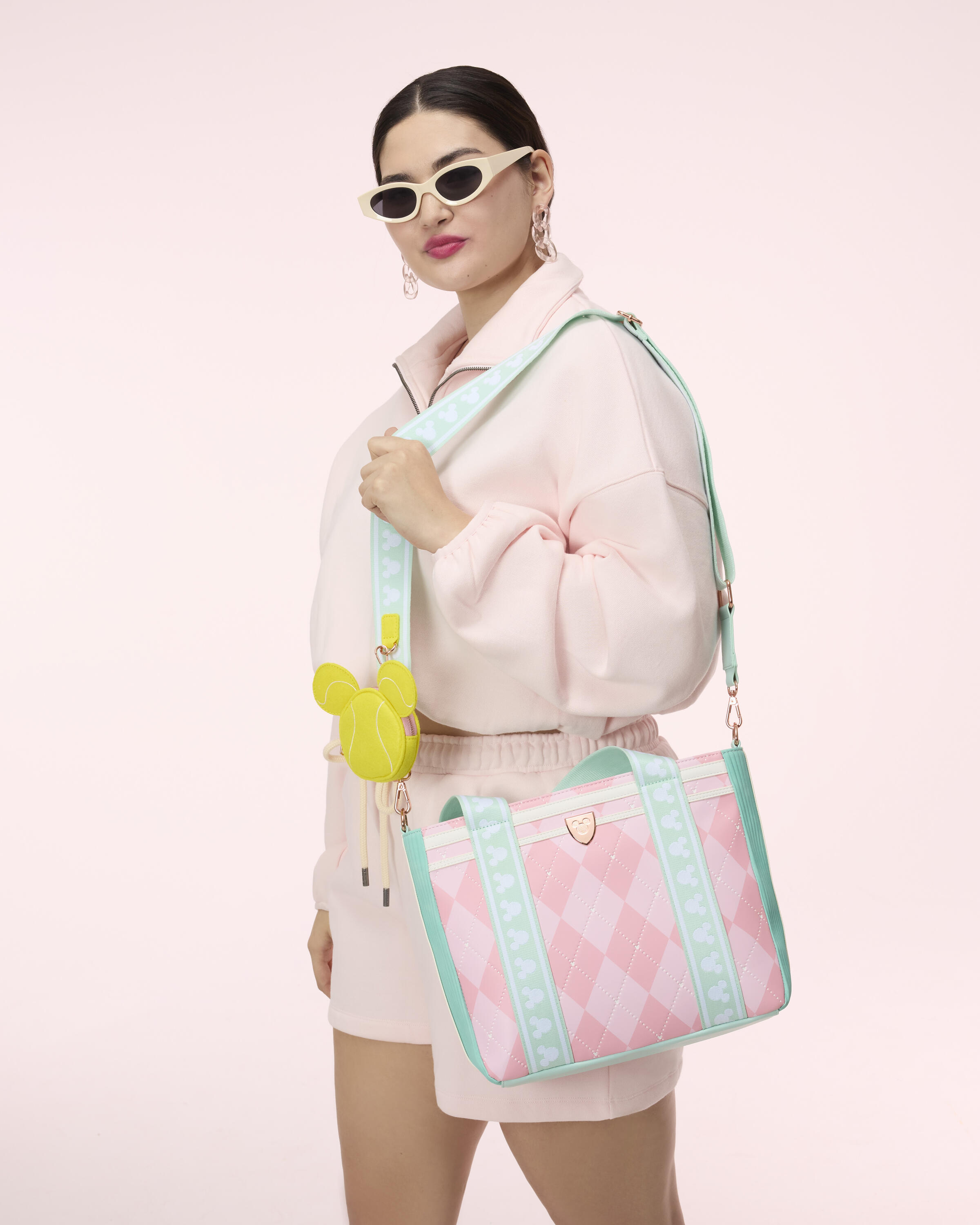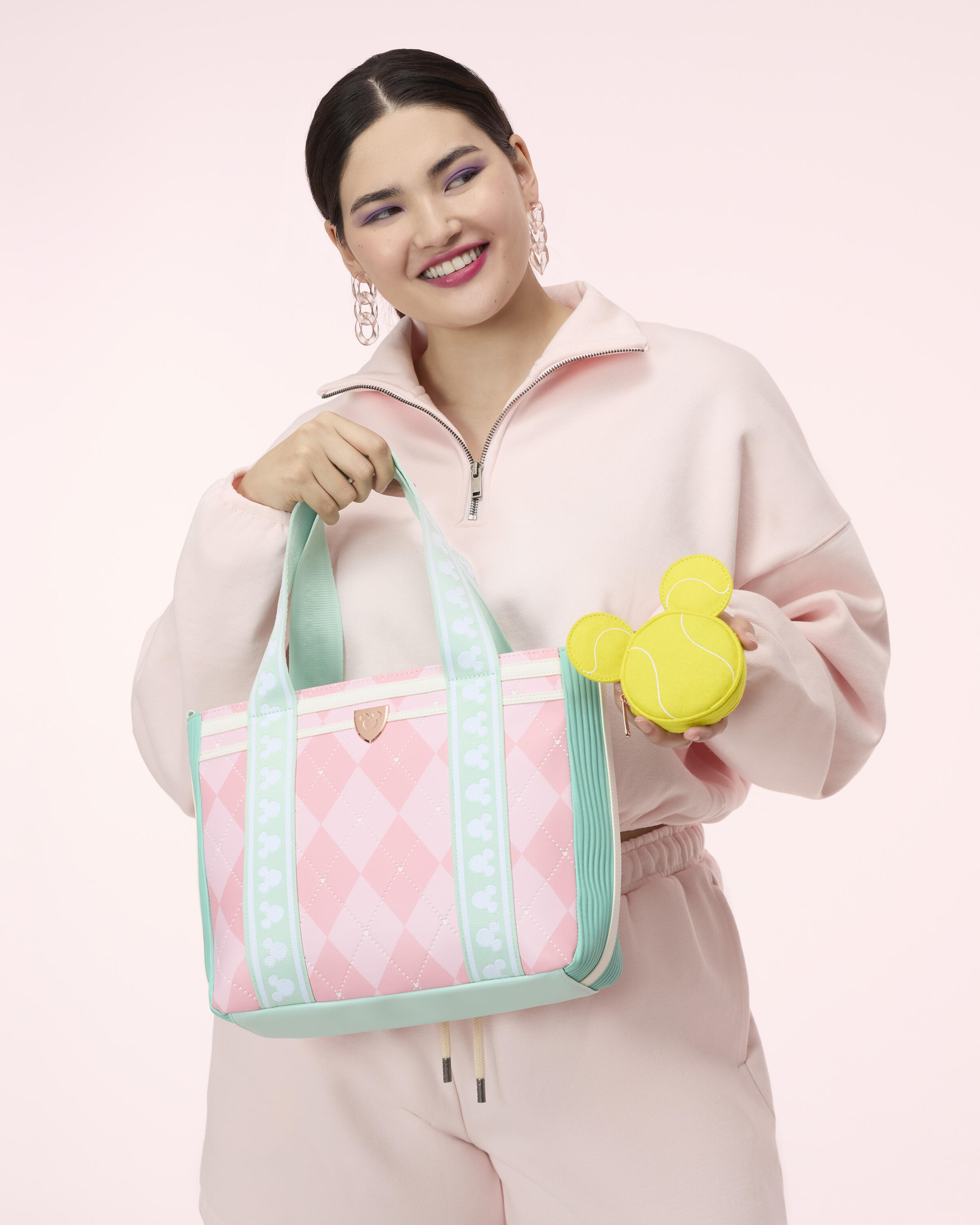 Ce ravissant sac tote tout allie le style Disney à la mode du tennis. Ce sac tote a un motif losanges rose et un charm en métal moulé en 3D représentant la silhouette de Mickey Mouse. Les bretelles arborent un motif répétitif de silhouettes de Mickey Mouse, et le porte-monnaie ressemble à une balle de tennis reprenant la silhouette de Mickey !