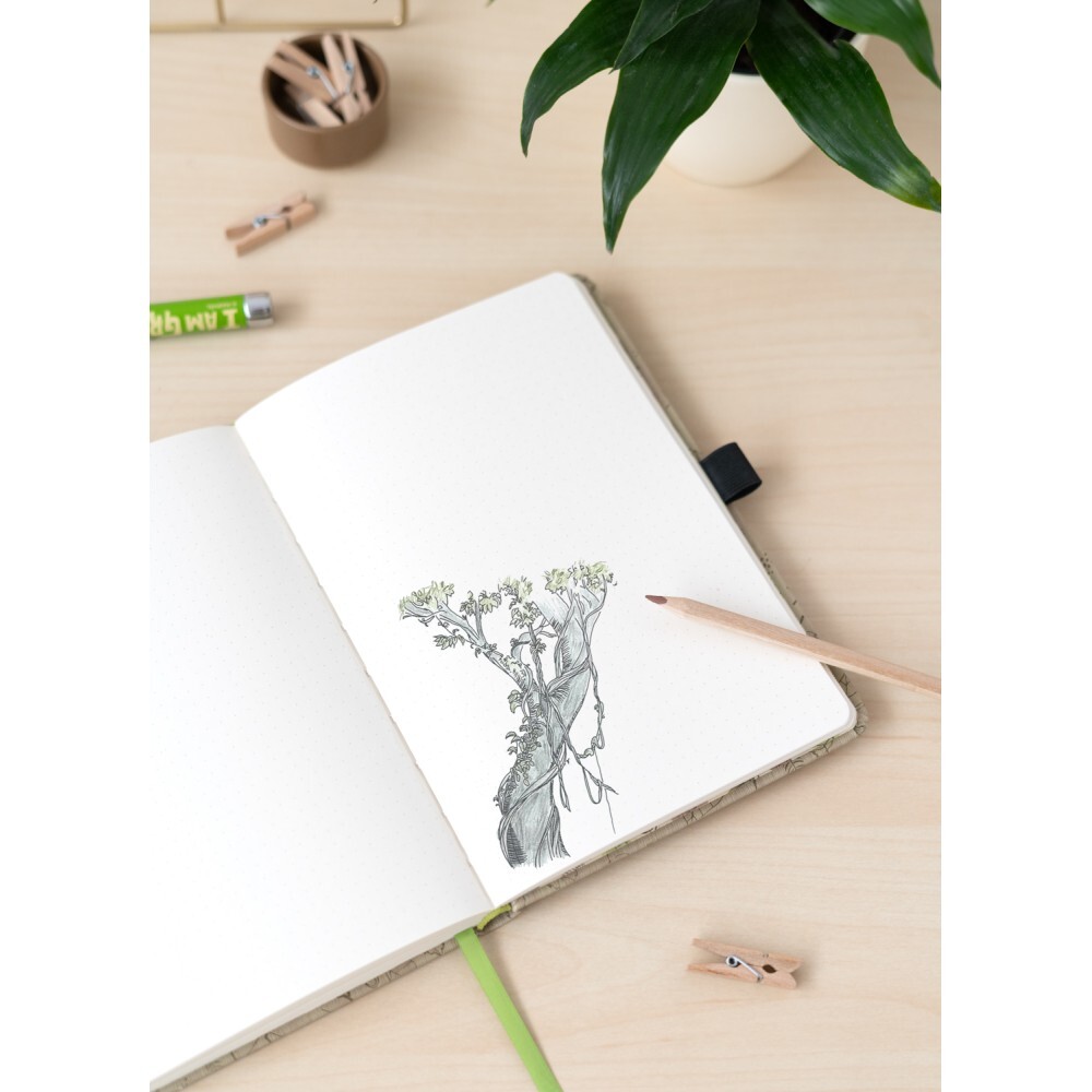 Cahier A5 à couverture rigide avec stylo projecteur intégré.
