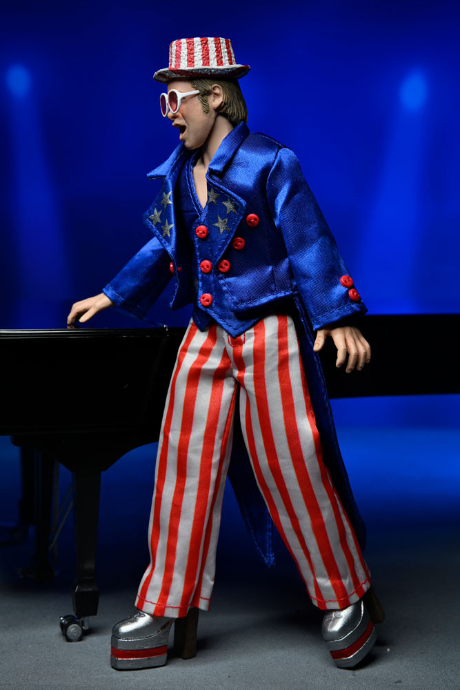 Taille de la figurine articulée env. 20 cm avec accessoires, dont le piano d'Elton, et des vêtements en tissu détaillés, dans un emballage boîte-fenêtre.
