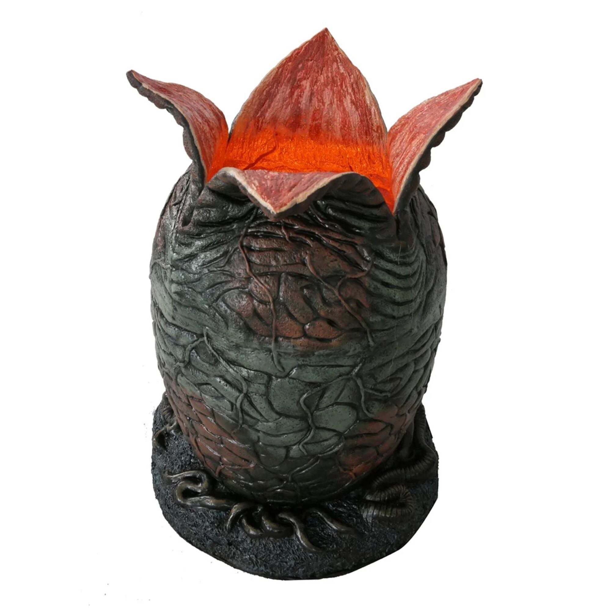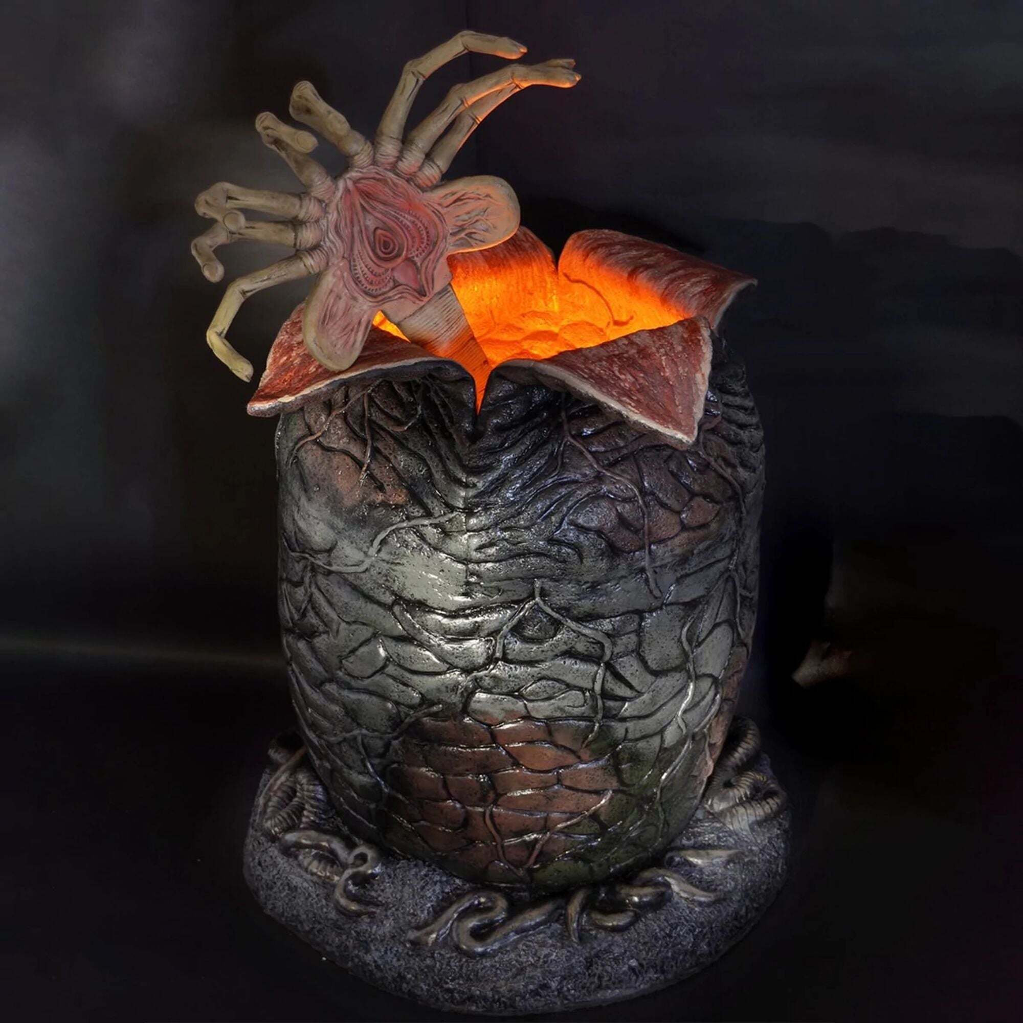 ""Transformez n'importe quelle pièce en un terrifiant nid de reproduction d'aliens avec cet Œuf de Xenomorph en taille réelle . Accompagné de son propre éclairage sinistre! Tel que vu dans le classique film d'horreur de 1986, Aliens, cette figurine grandeur nature mesure près de 91 cm de hauteur, et des volets articulés avec une armature métallique vous permettent d'ouvrir réellement les plis supérieurs de l'œuf. Le facehugger grandeur nature inclus possède une queue flexible, vous permettant de le positionner n'importe où... en attente de tomber sur une proie sans méfiance depuis le haut, ou simplement en embuscade à l'intérieur de l'œuf. L'Œuf de Xenomorph en taille réelle est fabriqué en mousse détaillée et peinte à la main, et il tient debout par lui-même. Un interrupteur active les lumières LED à l'intérieur de la base pour créer un effet de lueur menaçant et extraterrestre. Nécessite 3 piles AAA, non incluses." Height : 90cm