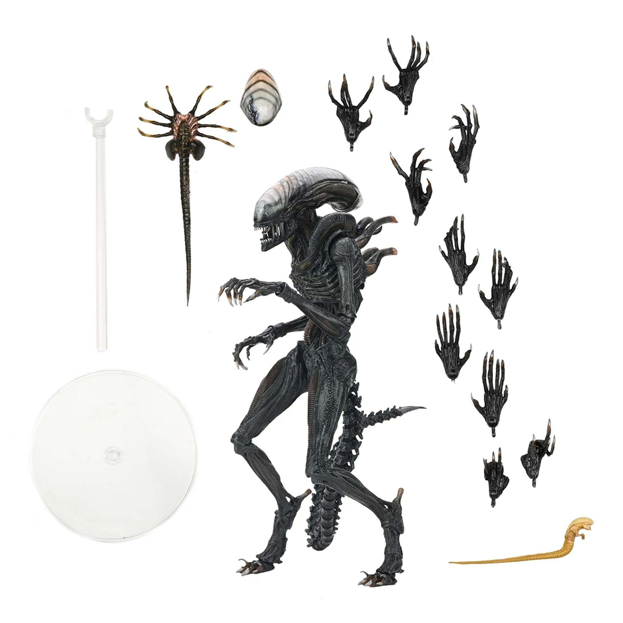 Parmi les accessoires, on retrouve des mains interchangeables, un facehugger, des chestbursters avec queues articulées, ainsi qu’un support de présentation pour des poses dynamiques.