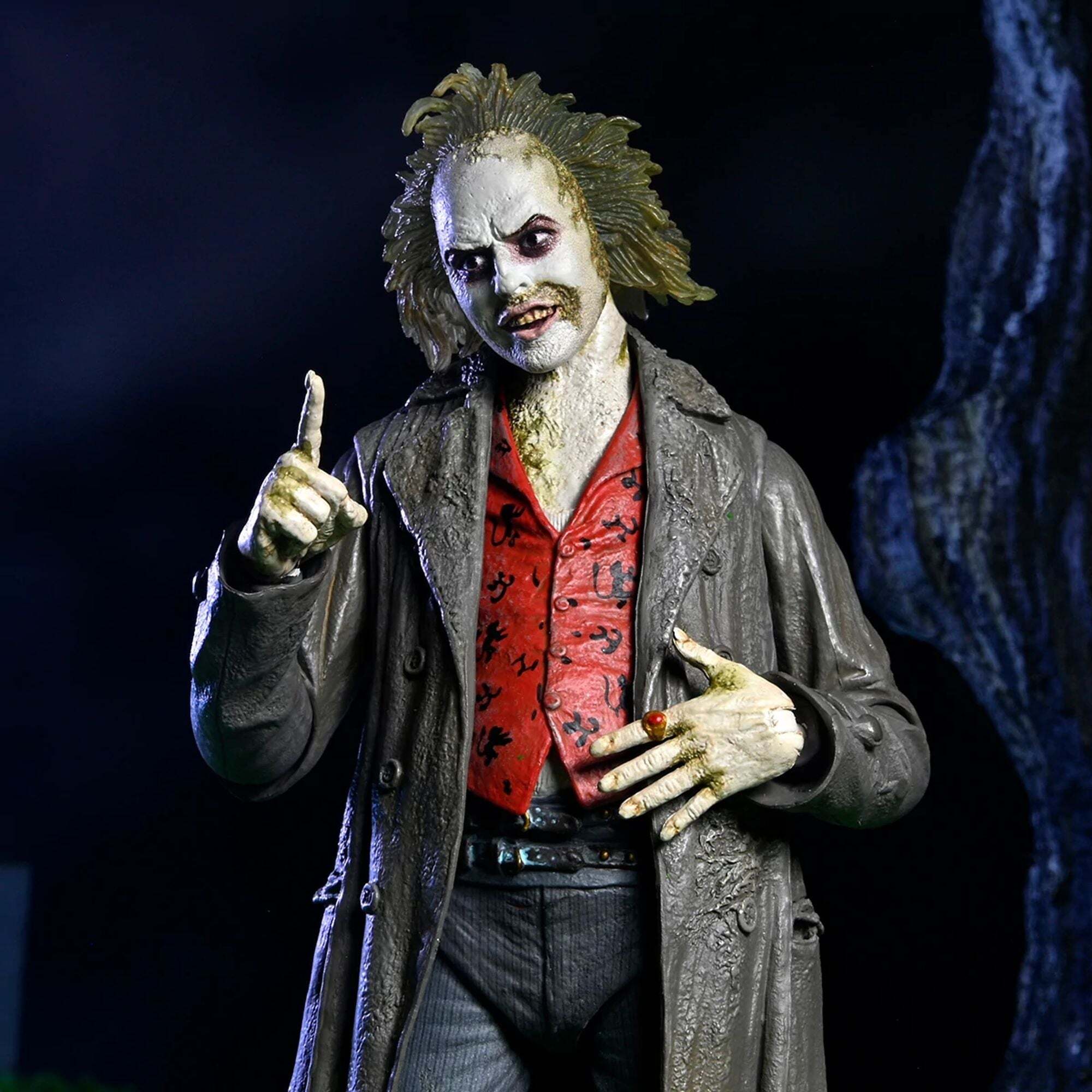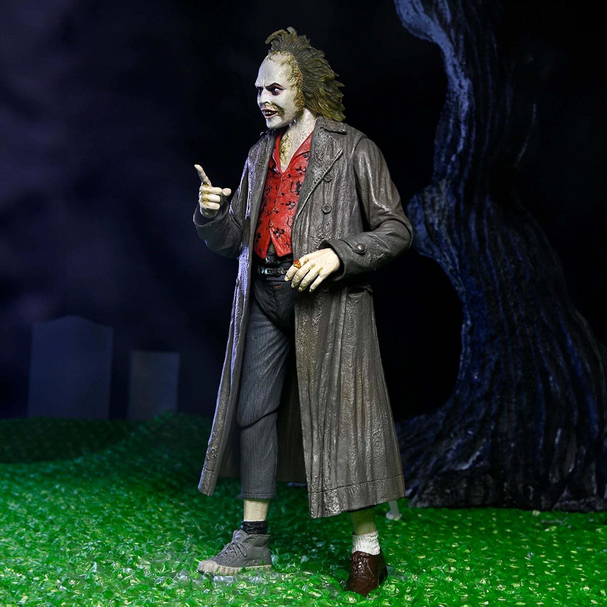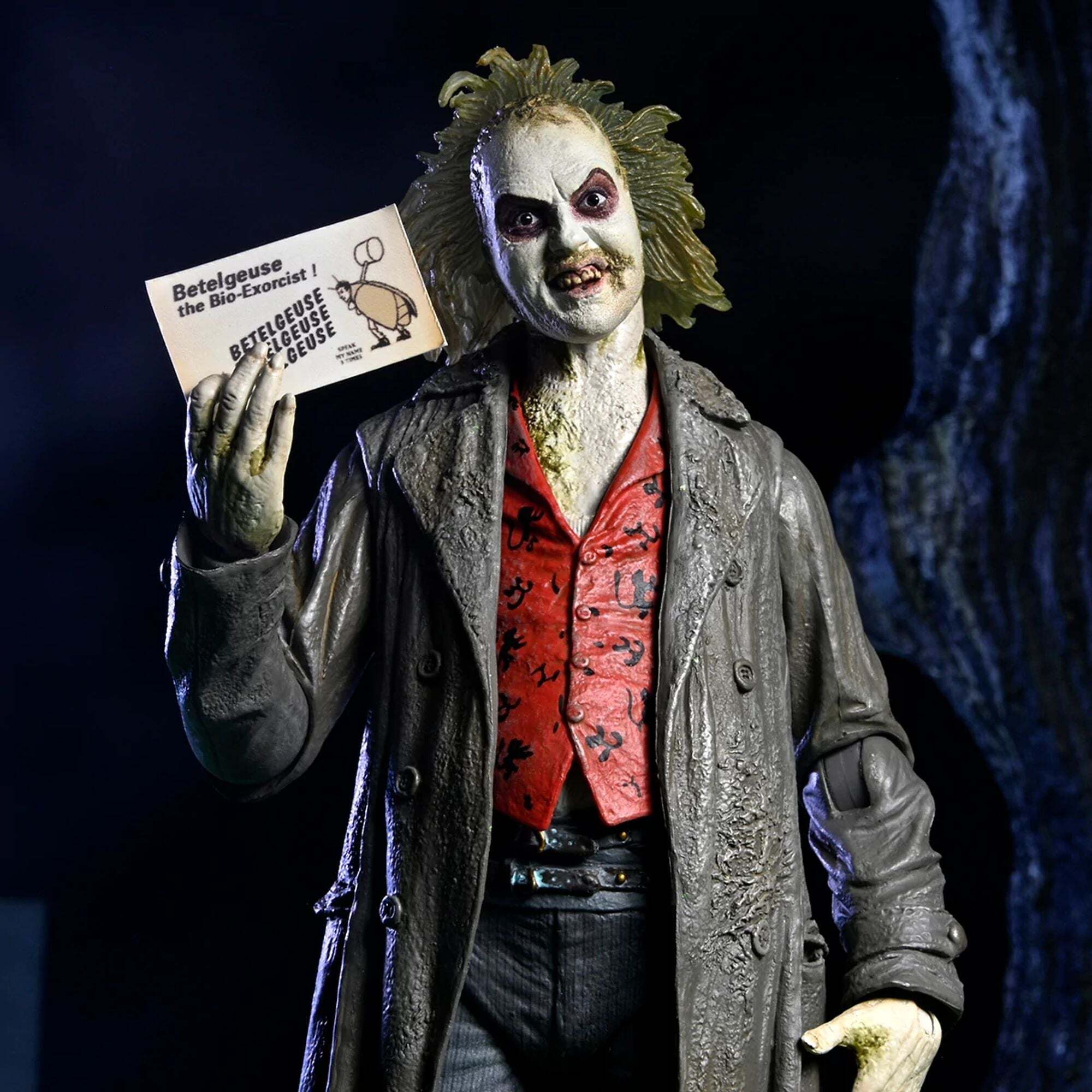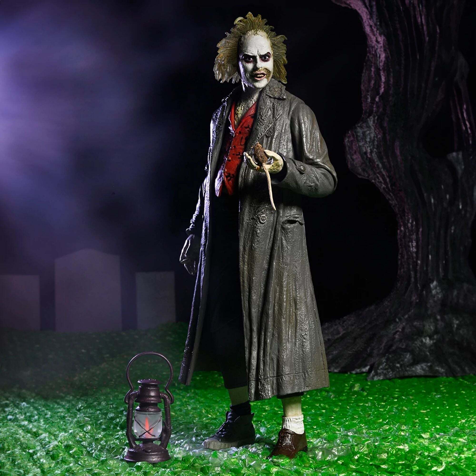 ""Besoin d'effrayer les vivants et de protéger votre repaire ? Dites simplement ""Beetlejuice"" trois fois et laissez l'exorciste le plus déjanté de l'au-delà se manifester ! Le fantôme le plus fou de la comédie culte de Tim Burton de 1988 revient sous la forme d'une figurine Ultimate NECA ! Beetlejuice est vêtu de son look emblématique de ""guide touristique"", tel qu’il se présente pour la première fois dans le film. Cette figurine détaillée de 18 cm est entièrement articulée pour des poses variées et inclut une multitude d'accessoires surnaturels : des visages interchangeables, un chapeau, des mains, un rat mort, des prospectus de Betelgeuse, un journal, et une lanterne ! Elle est livrée dans un packaging boîte fenêtre à cinq panneaux." Height : 18cm