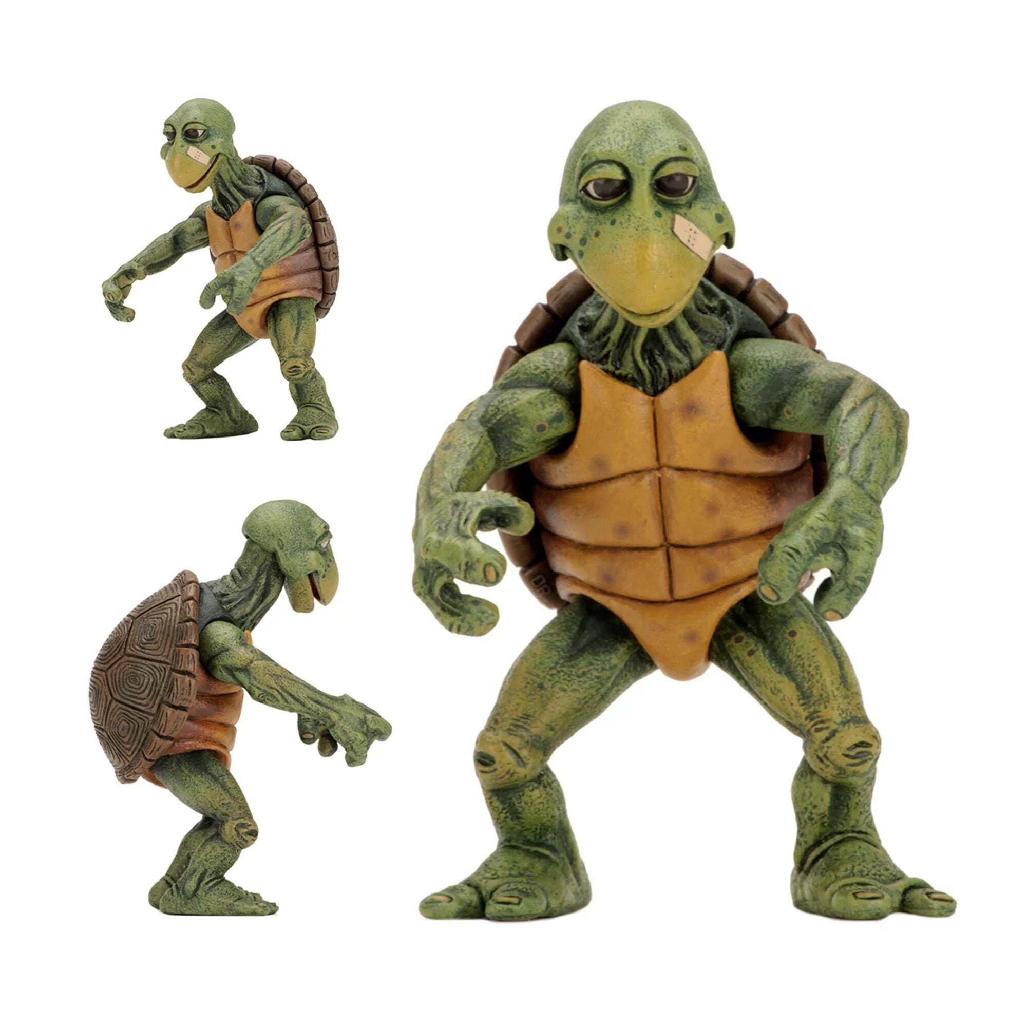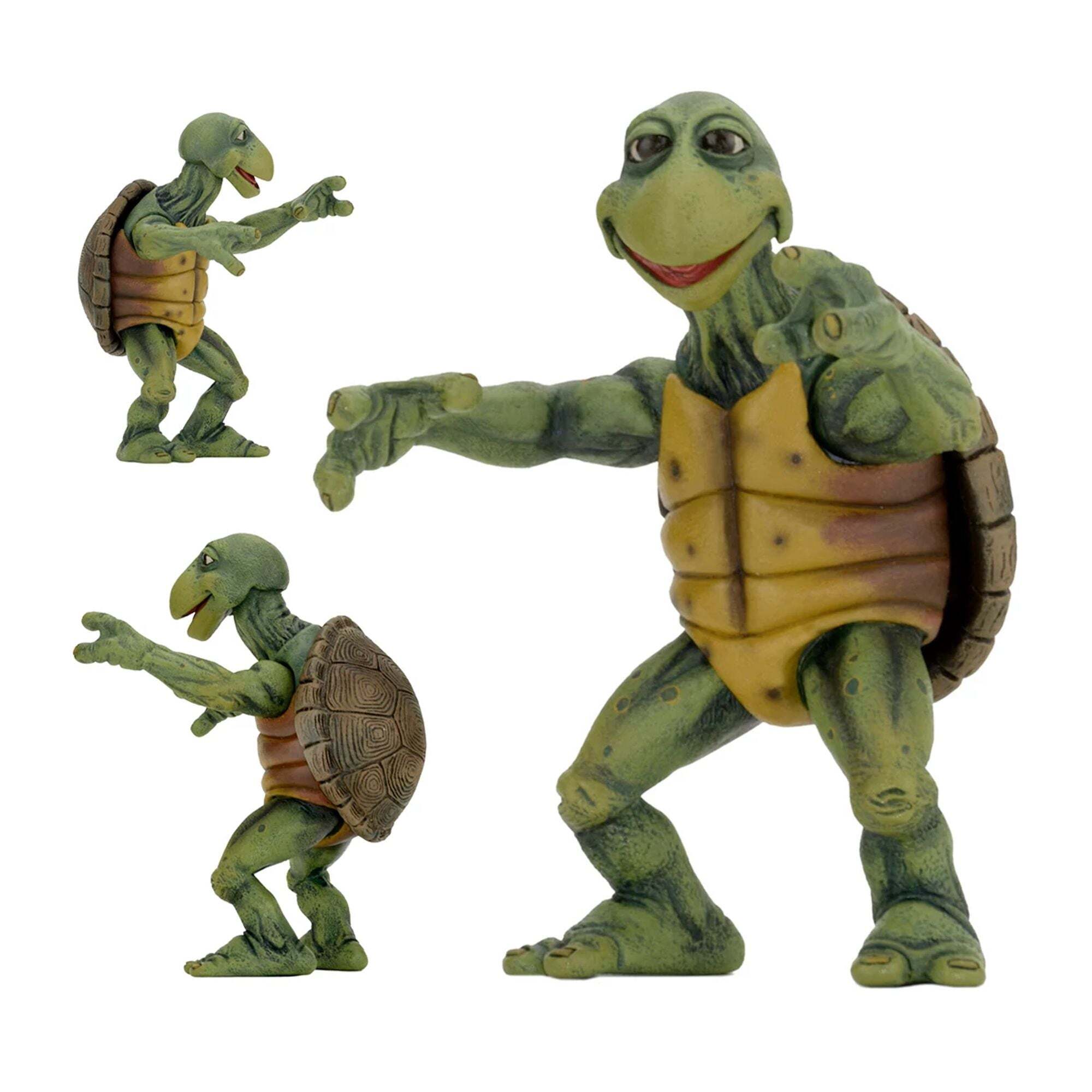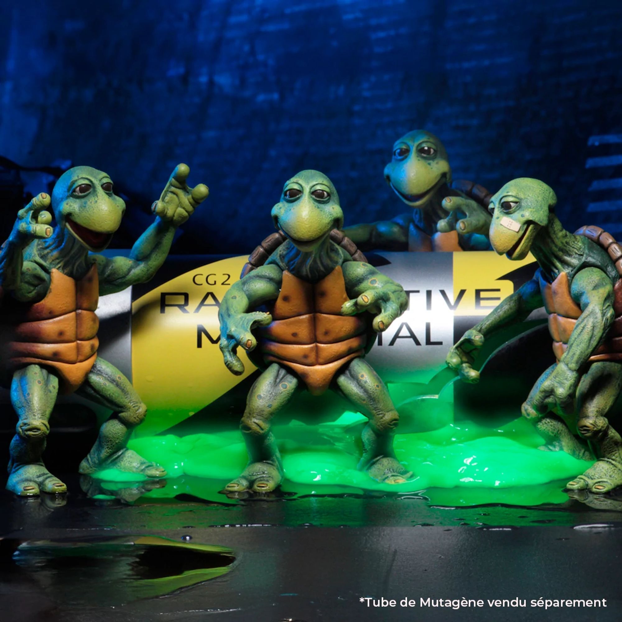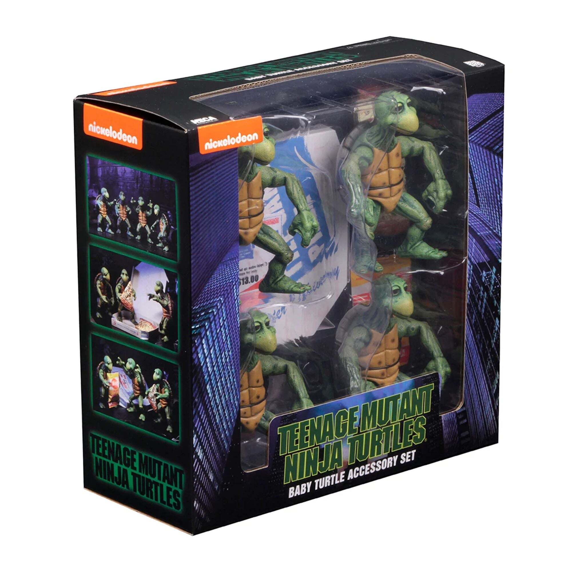 ""Après avoir pataugé dans une flaque de déchets radioactifs, ces tortues deviennent le plus célèbre quatuor justicier de New York ! Encore toutes petites, les Baby Turtles sont prêtes à s’entraîner auprès de leur maître Splinter. Ces figurines détaillées et articulées mesurent environ 10 cm de haut et sont parfaitement à l’échelle des figurines NECA 1/4 (Michelangelo, Donatello, etc.). Le coffret comprend : - 4 bébés Tortues - 1 boîte à pizza - 4 parts de pizza - 1 sachet de chips de maïs Bonus exclusif : une paire de nunchakus et une main alternative tournoyante pour la figurine Michelangelo 1/4 NECA (vendue séparément) Le tout dans un packaging vitrine pour collectionneurs." Height : 10cm