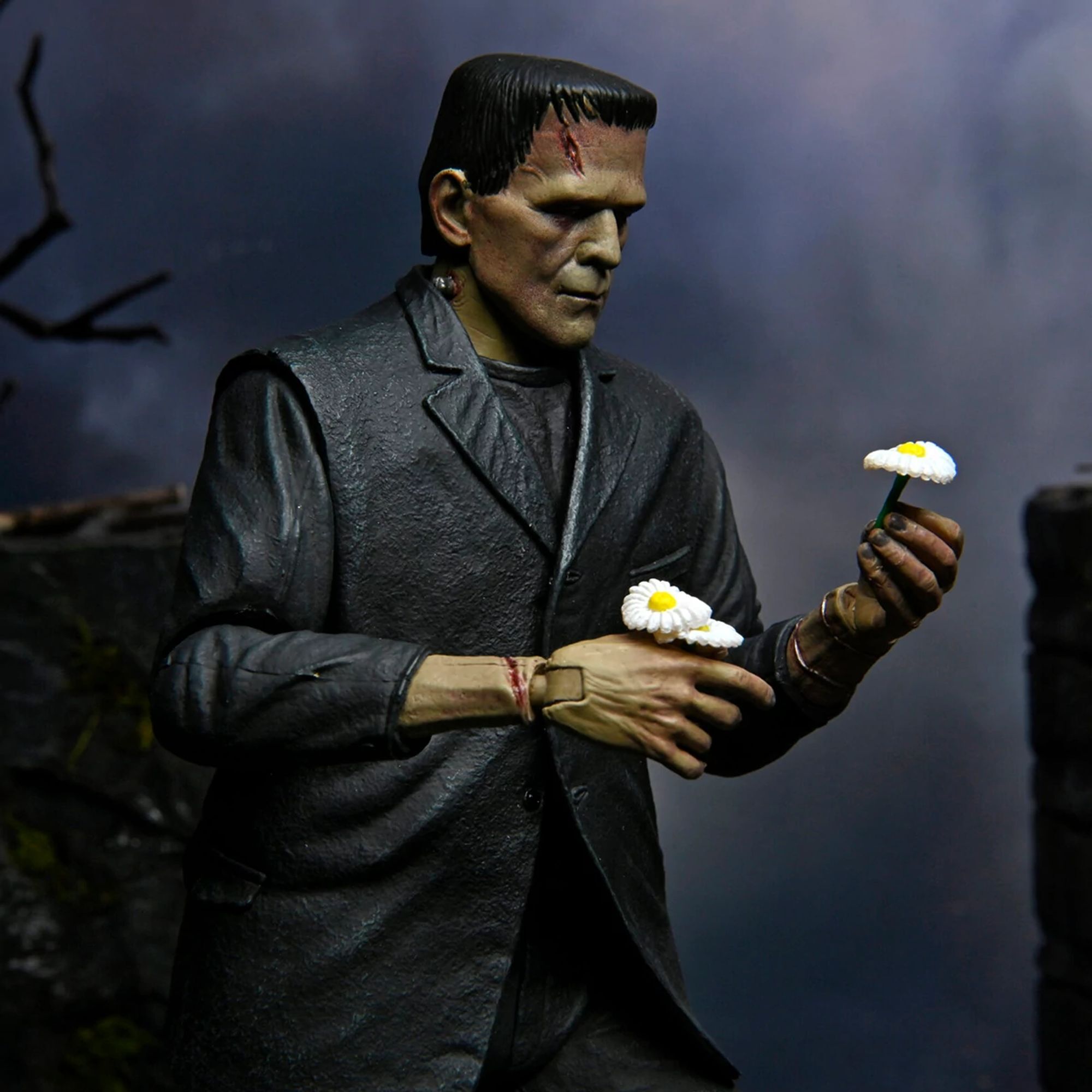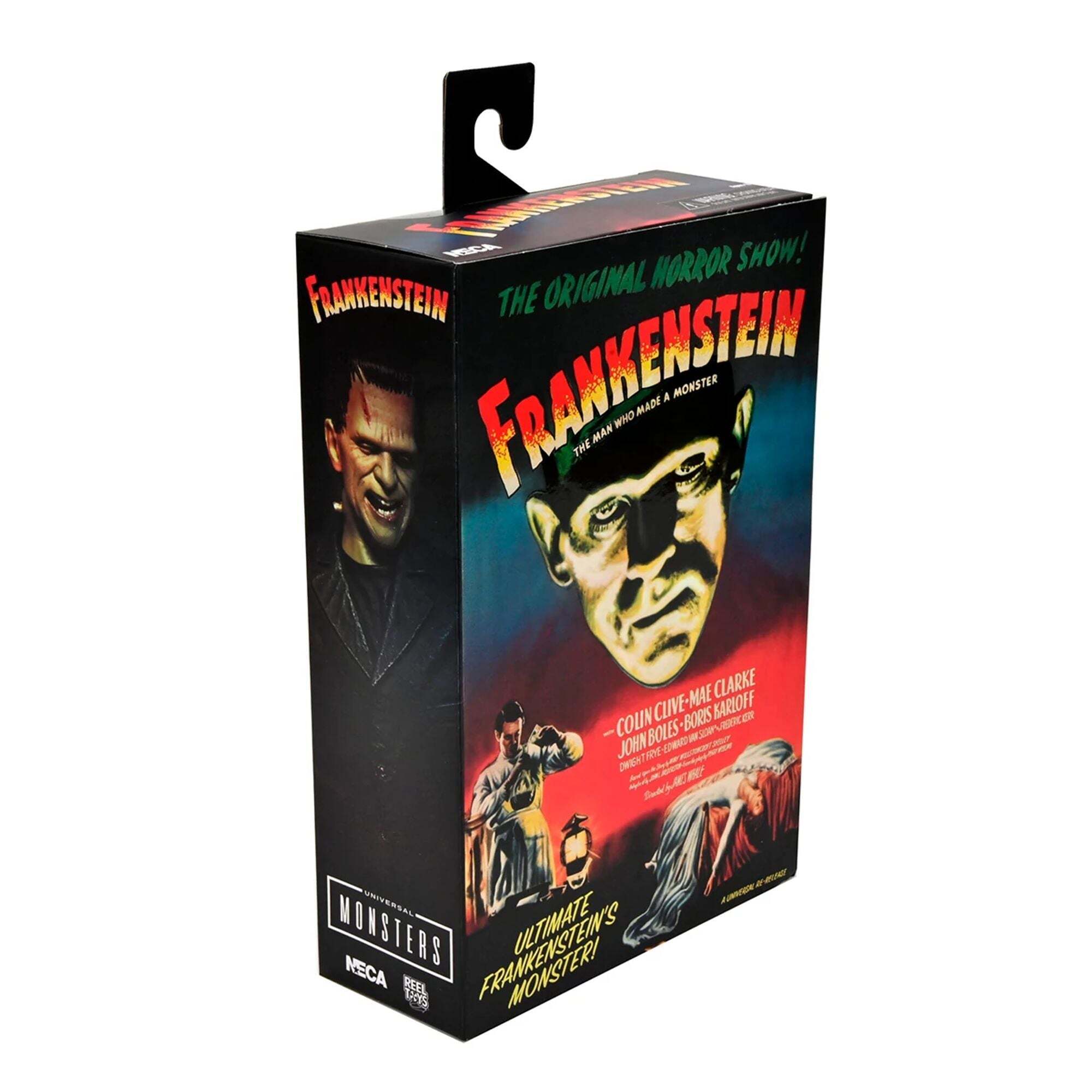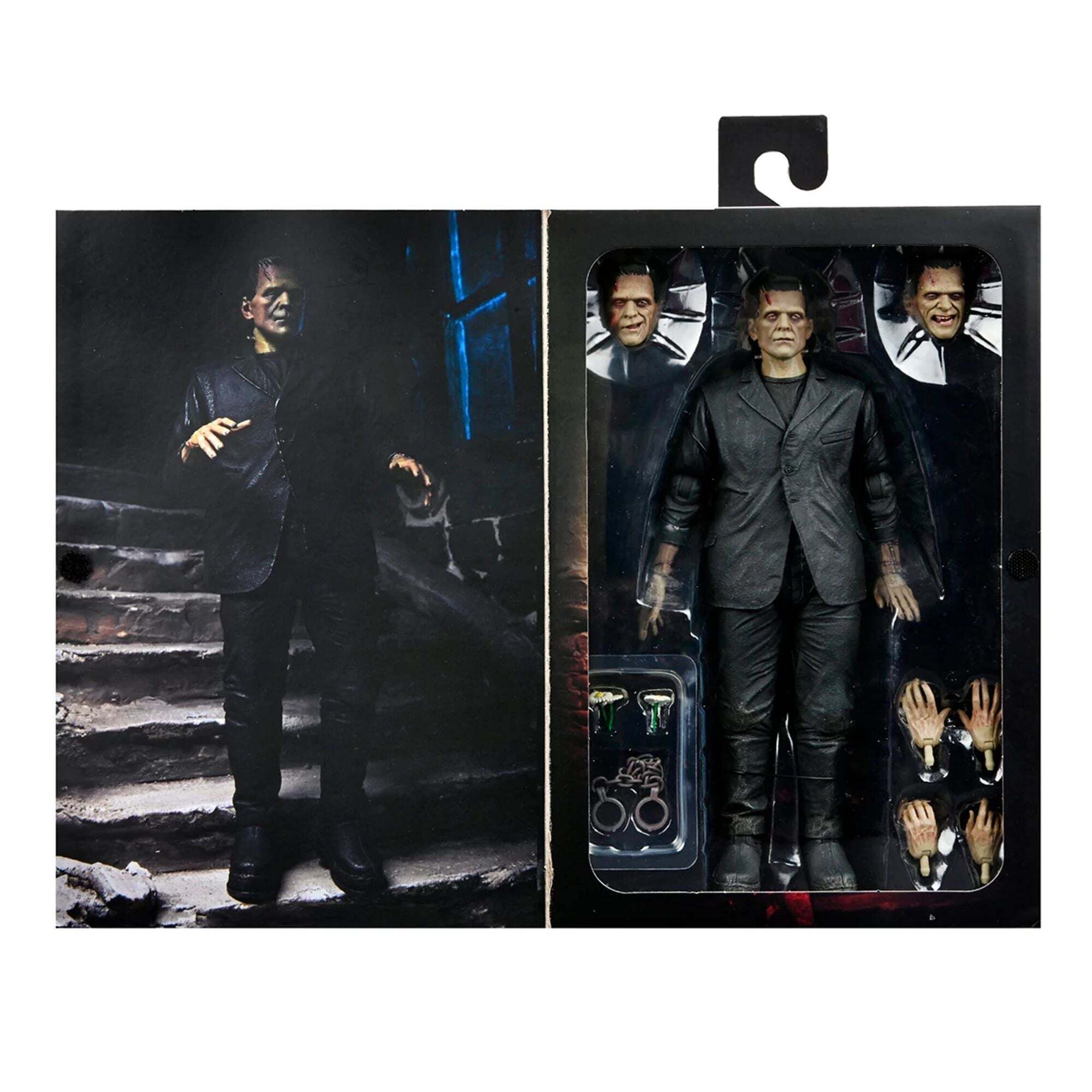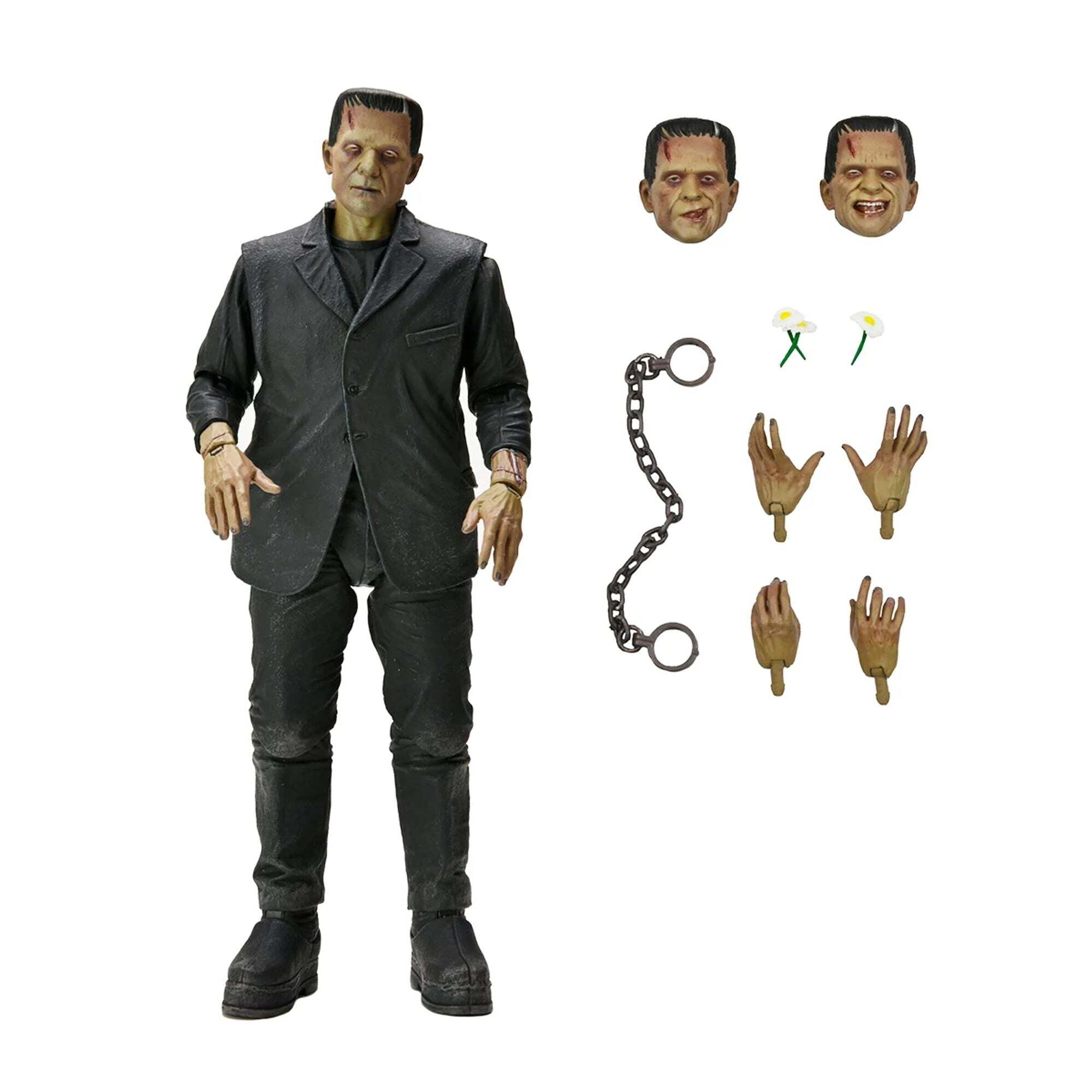 ""Pour célébrer le 90e anniversaire du grand classique du cinéma Frankenstein, NECA inaugure avec panache l’arrivée des Universal Monsters dans sa gamme de figurines Ultimate ! La sculpture rend hommage à l’interprétation bouleversante du monstre incompris par Boris Karloff, ici présentée en version colorisée. La figurine de 18 cm est accompagnée de nombreux accessoires : 3 têtes interchangeables, 6 mains interchangeables, des chaînes et un bouquet de marguerites. Le tout présenté dans un emballage collector spécial anniversaire." Height : 18cm