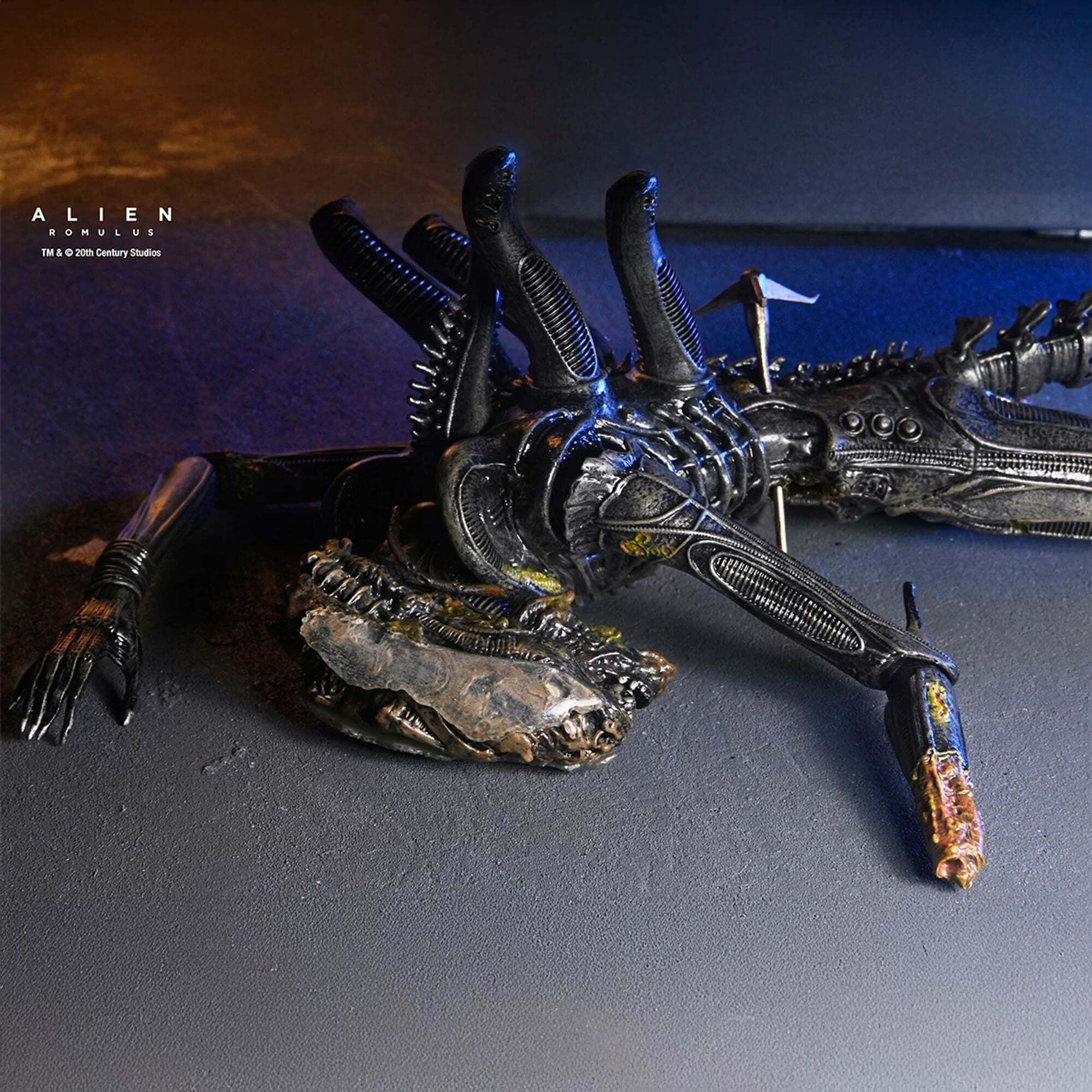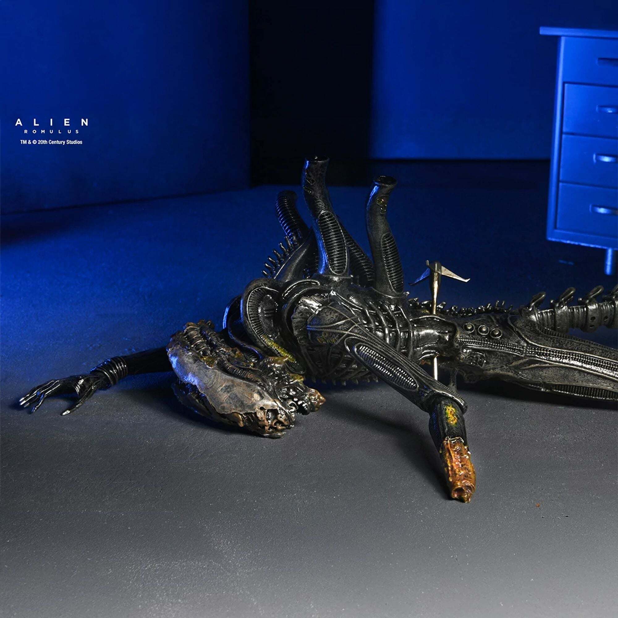 Une édition collector inspirée du film à succès de Fede Alvarez sorti en 2024. Tout droit sorti du terrifiant nouveau chapitre de la saga Alien, Alien: Romulus, le légendaire Xénomorphe fait son grand retour dans une édition collector spectaculaire ! Après un affrontement sanglant avec les forces de sécurité de Weyland-Yutani, la créature extraterrestre est découverte suspendue dans le laboratoire du vaisseau… Son sang acide, brûlant le sol, a permis aux scientifiques d'accéder directement à l'ADN de cette machine à tuer parfaite. Cette figurine NECA de deluxe recrée cette scène iconique : le Xénomorphe mutilé, suspendu par des câbles articulés pour un effet de lévitation réaliste. Elle inclut un élément de décoration murale représentant le plafond du laboratoire taché d'acide ; fixez-le au mur ou au plafond pour une présentation dynamique. Des détails ultra-réalistes incluent une mâchoire articulée, une mâchoire interne coulissante et une queue renforcée par des câbles pour une grande variété de poses. Le tout est présenté dans un coffret collector transparent, idéal pour mettre en valeur cette pièce maîtresse de votre collection Alien: Romulus. Hauteur: 18 cm