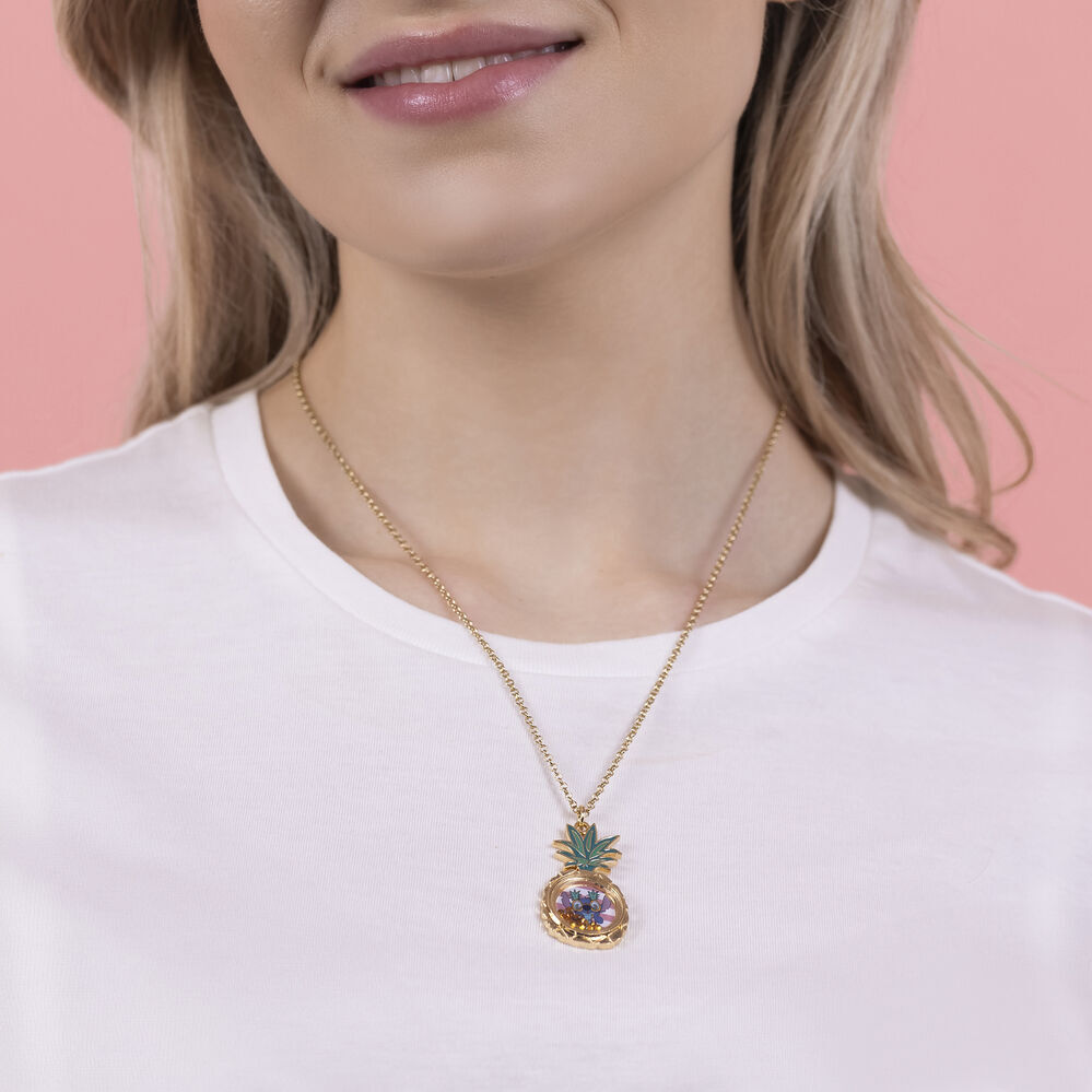 Avec un pendentif ananas émaillé en or avec pierres flottantes et chaîne en or.