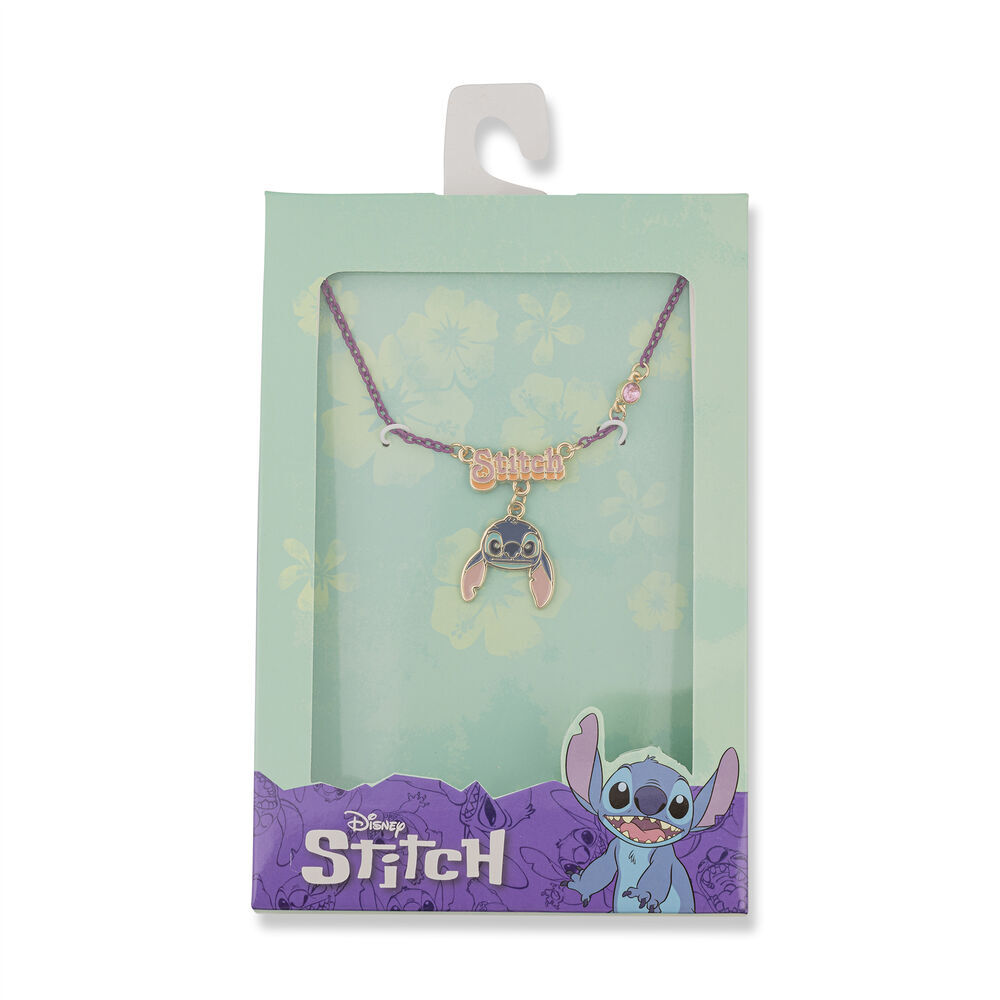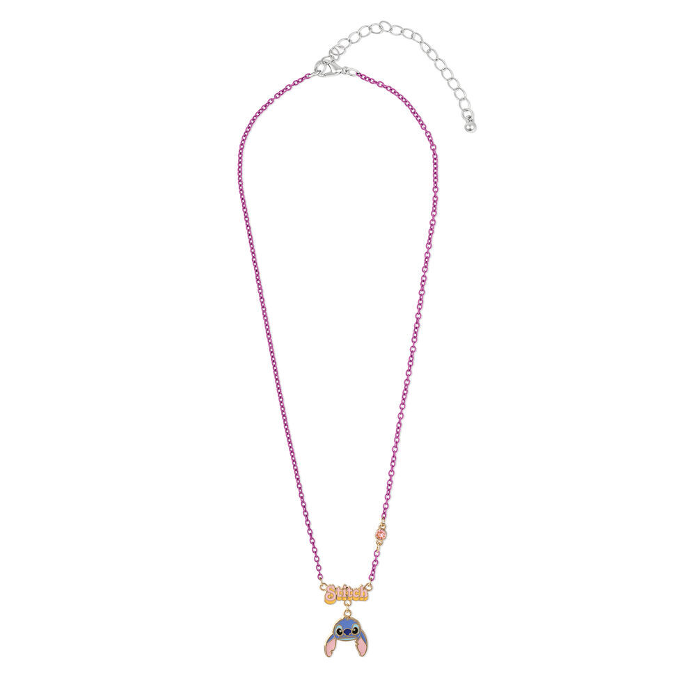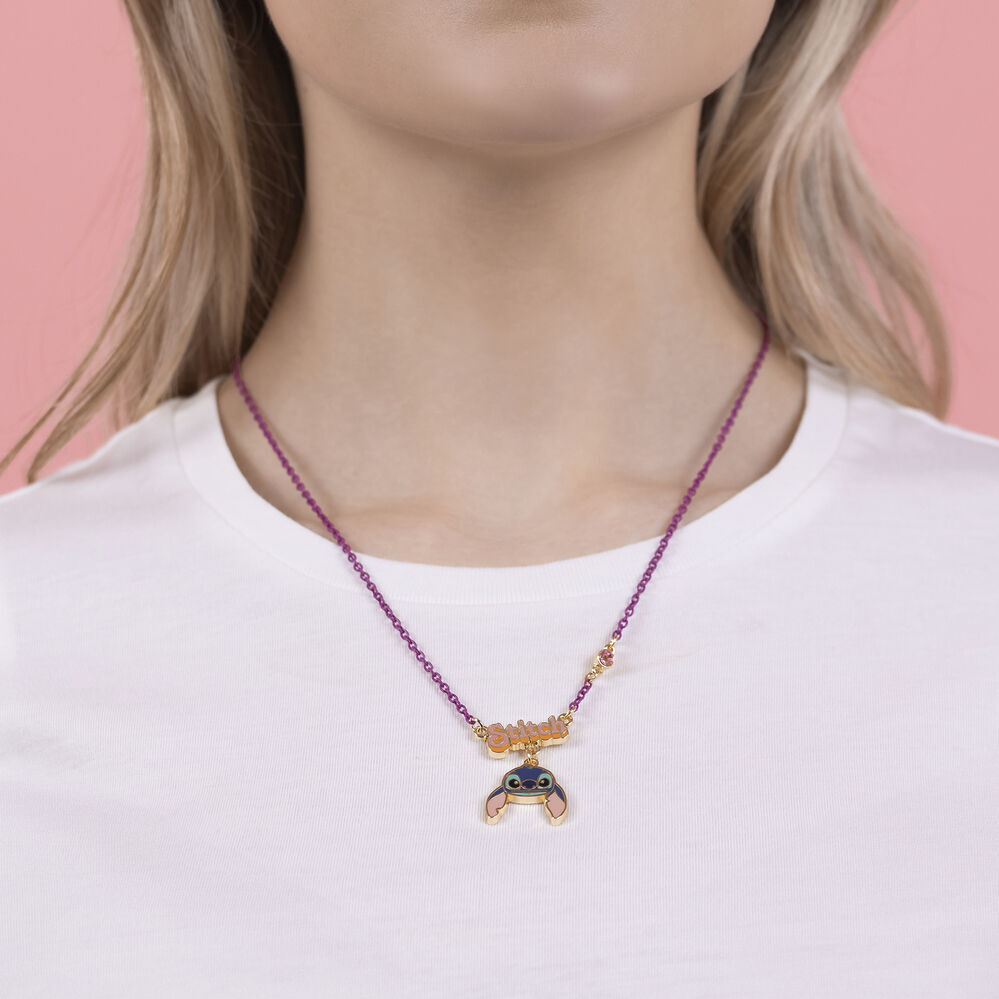 Caractéristiques Stitch avec un pendentif en forme de goutte et une chaîne violette.