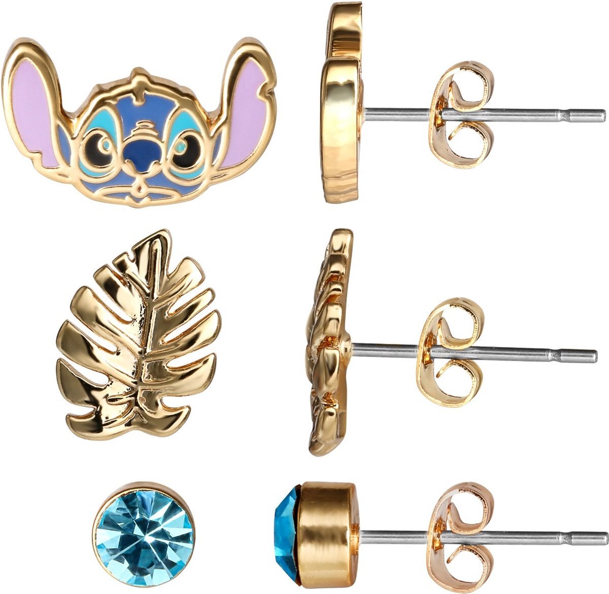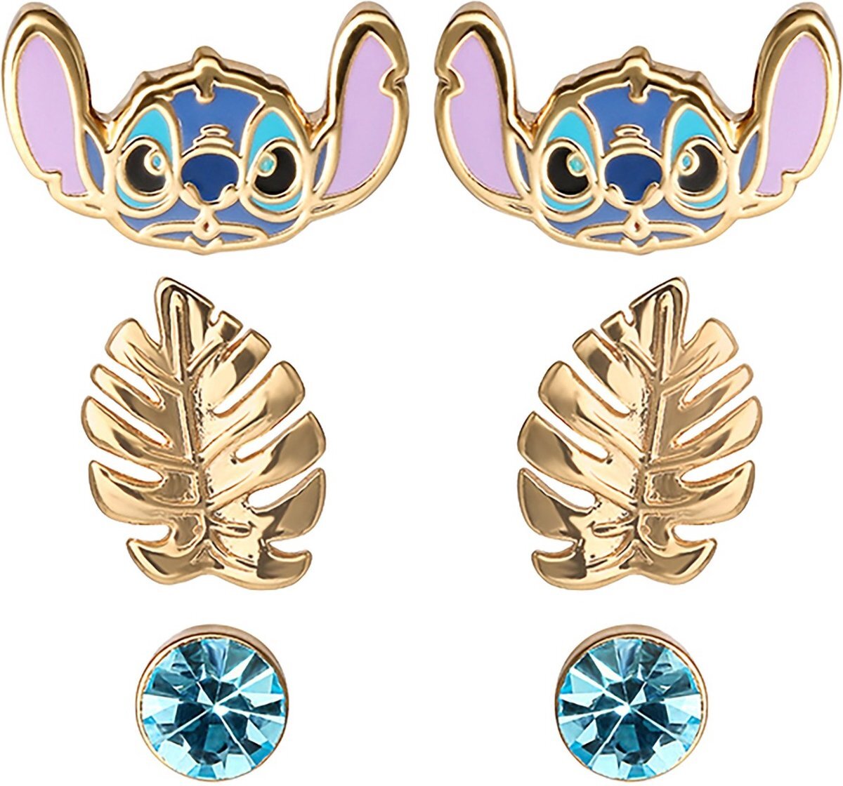 Le pack de boucles d'oreilles comprend des boucles d'oreilles Stitch remplies d'émail coloré, des boucles d'oreilles en feuille d'or et des boucles d'oreilles avec des pierres bleues.